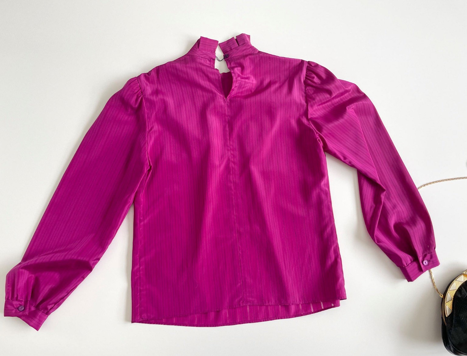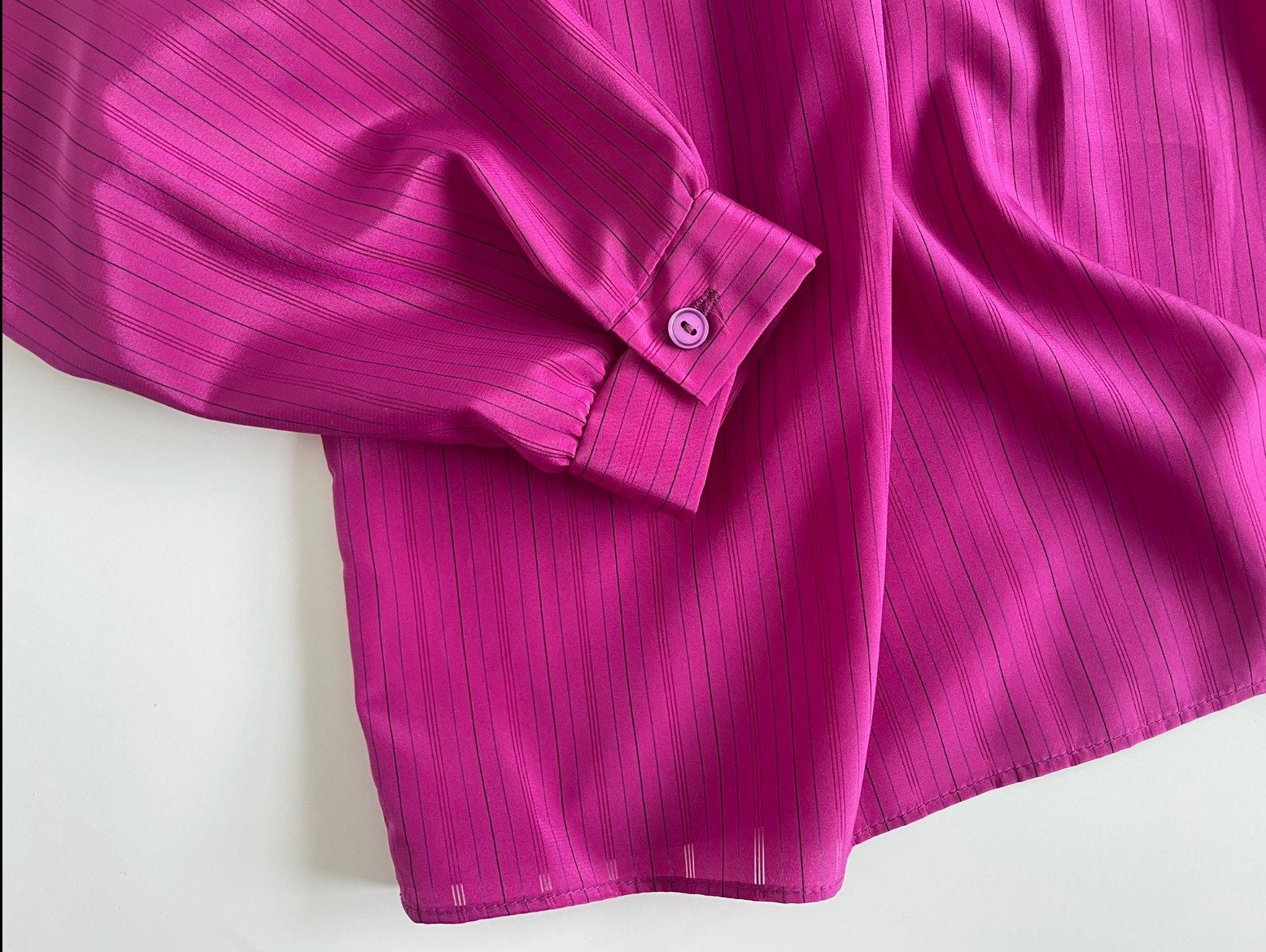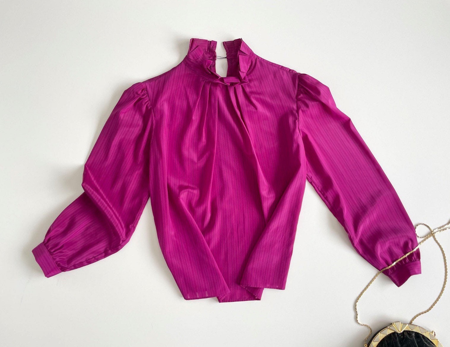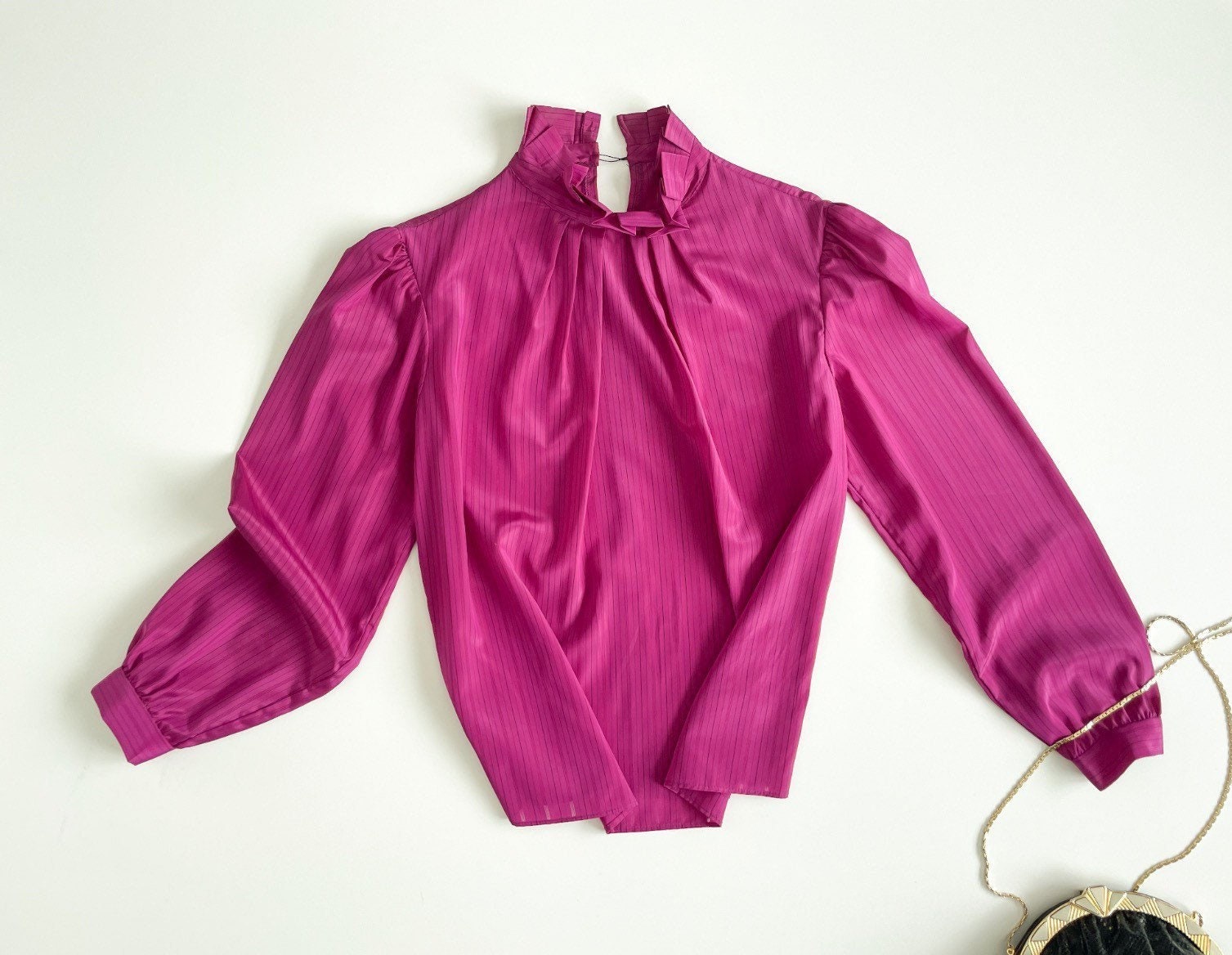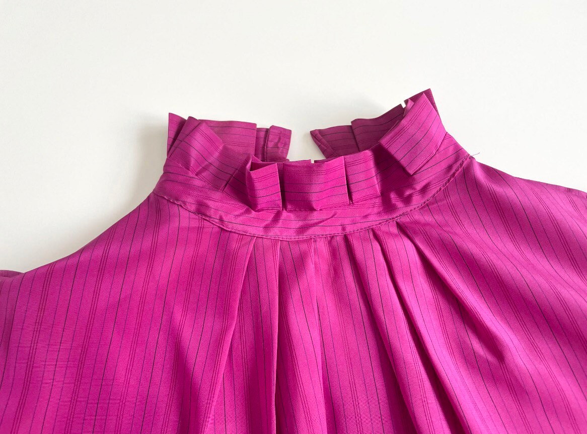 Beautiful 70s magenta-pink secretary silky blouse. Polyester fabric has a very subtle pinstripe with the skinny stripe being see-through. High ruffled neck with pleated neckline. Lightly pleated puff sleeves maintain puff with small shoulder pads. Button long sleeves.