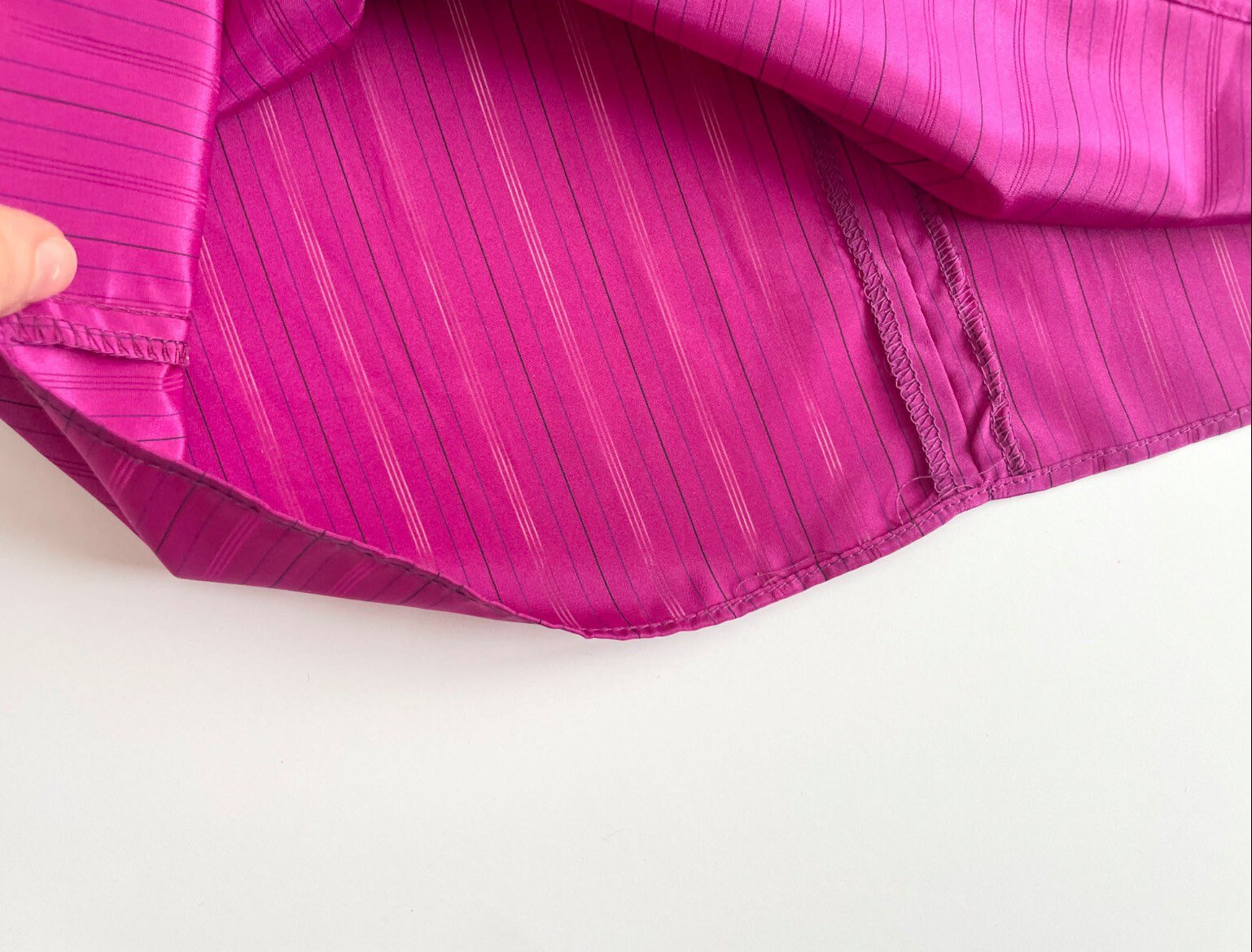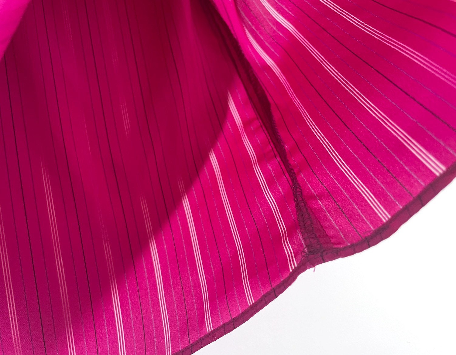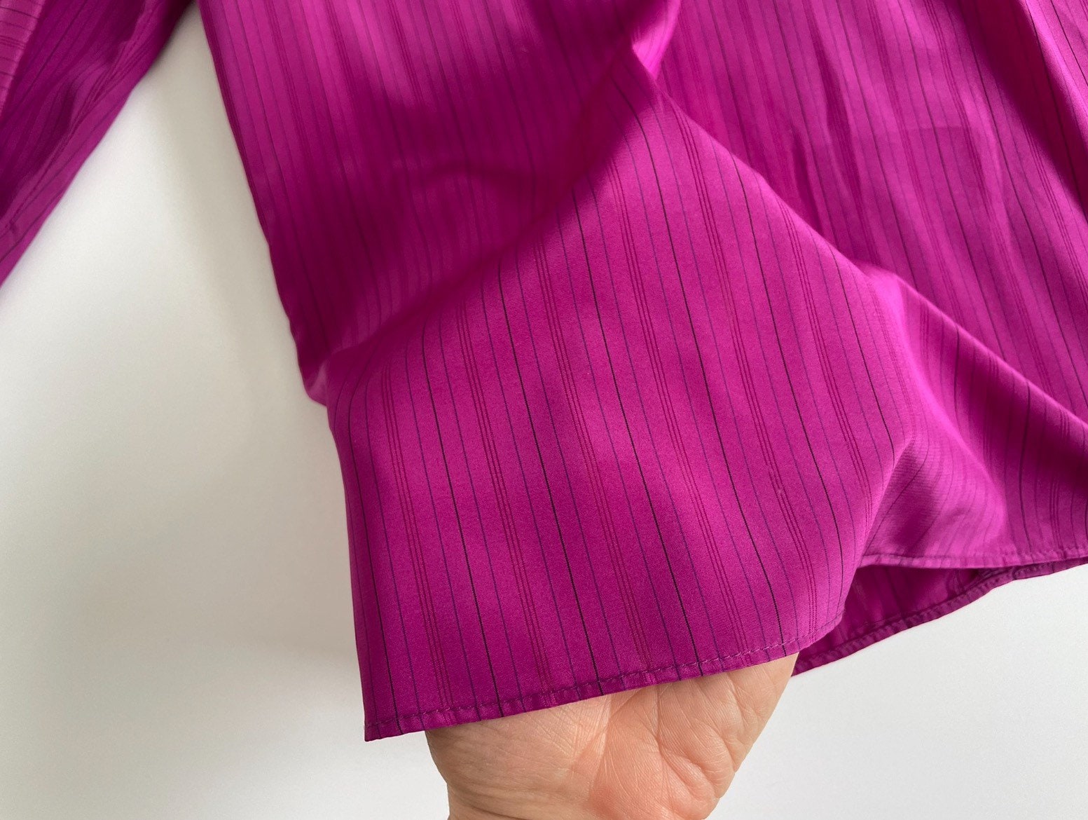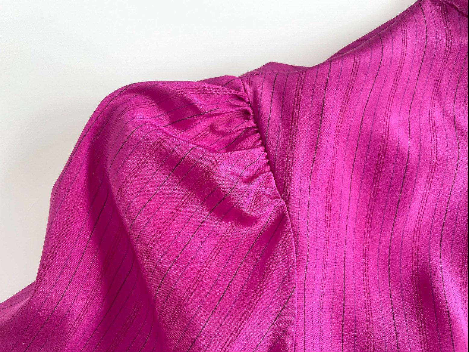 Beautiful 70s magenta-pink secretary silky blouse. Polyester fabric has a very subtle pinstripe with the skinny stripe being see-through. High ruffled neck with pleated neckline. Lightly pleated puff sleeves maintain puff with small shoulder pads. Button long sleeves.