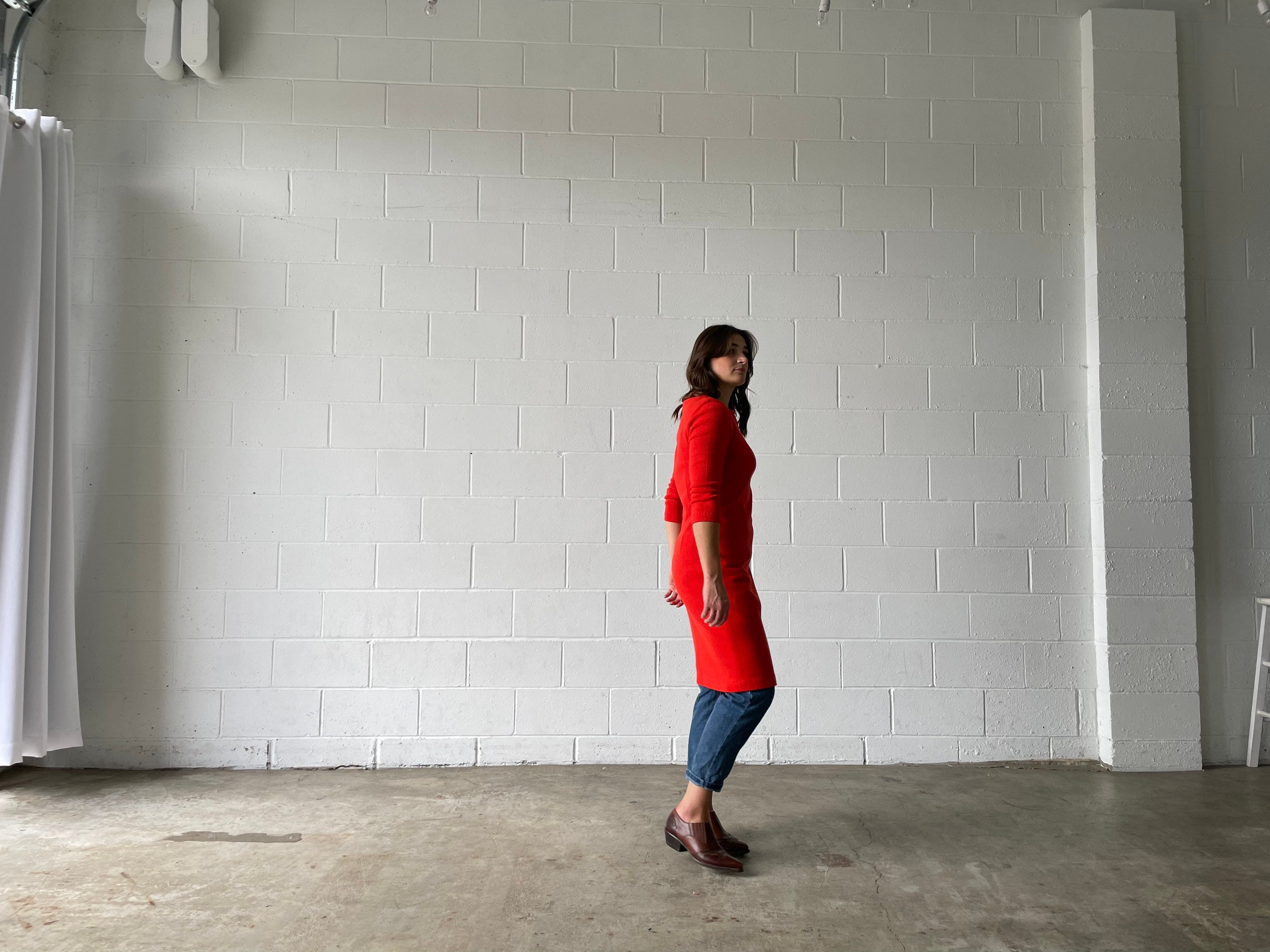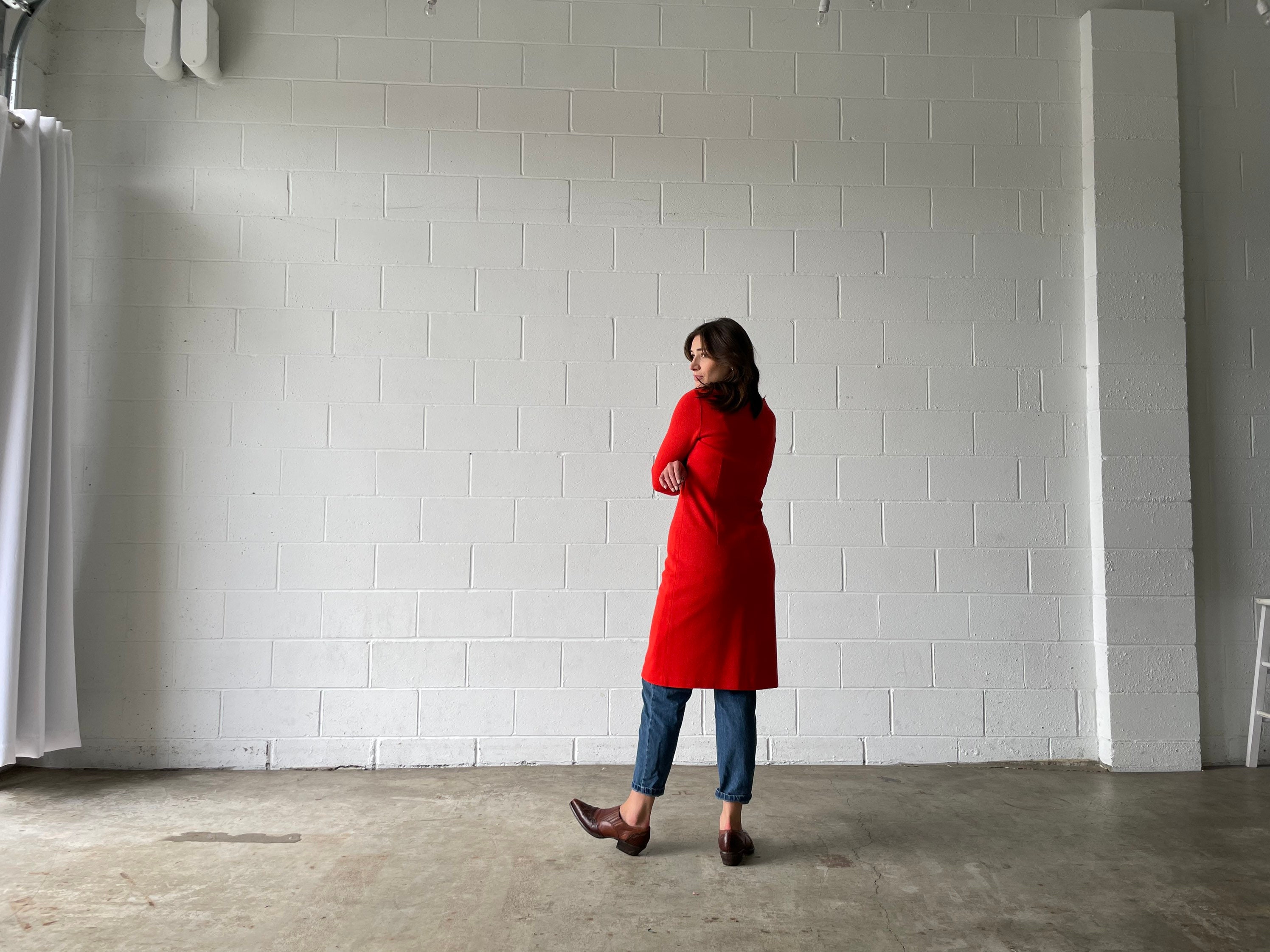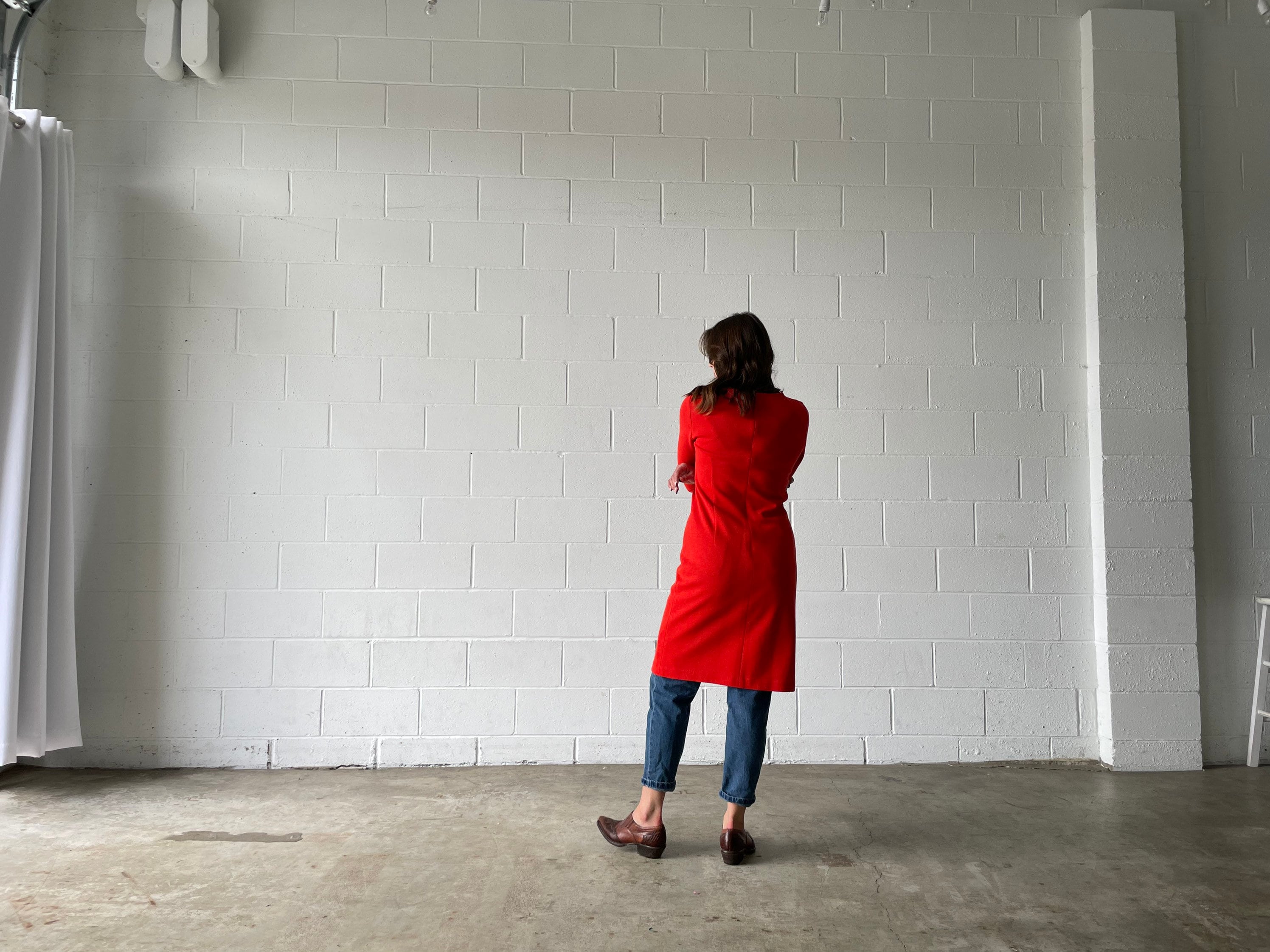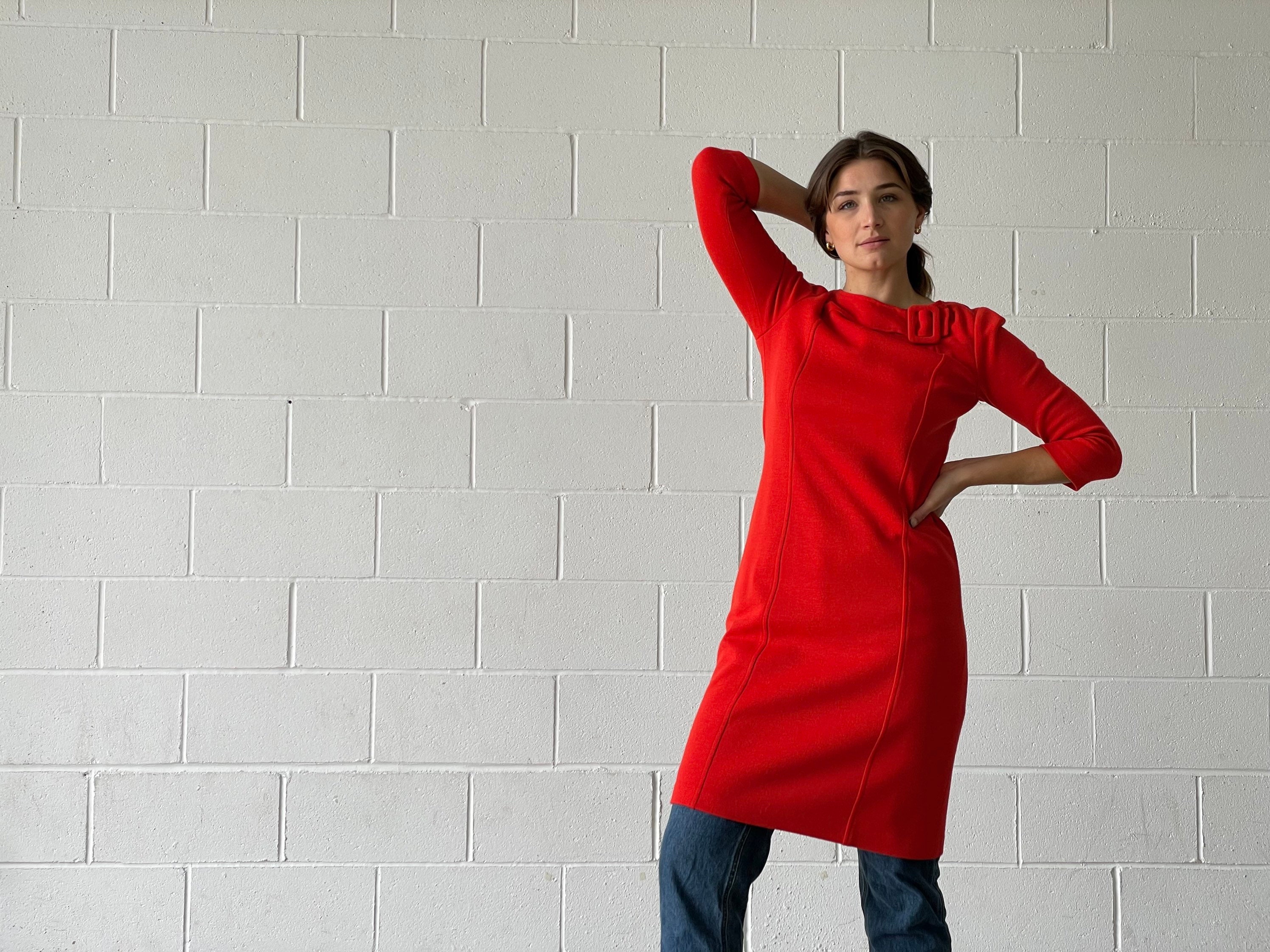 Thicker knit 60s-70s sheath dress in the most gorgeous orange-red. Lined so you won't see any lines. Functional large buckle at neckline. 3/4 sleeve. Zipper back.