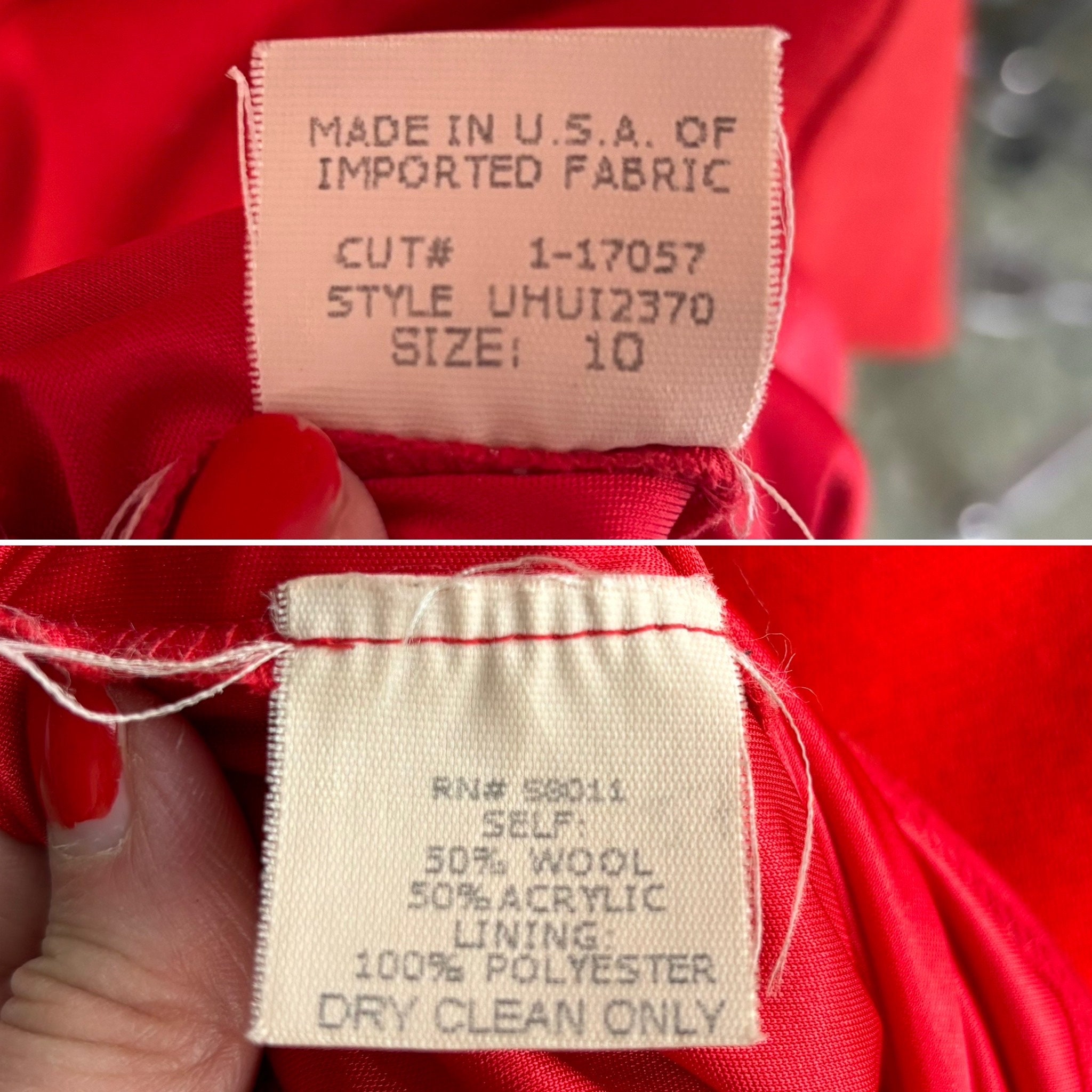 Dress is 50% wool and 50% acrylic. Lining is 100% poly. Made in USA of imported fabric.