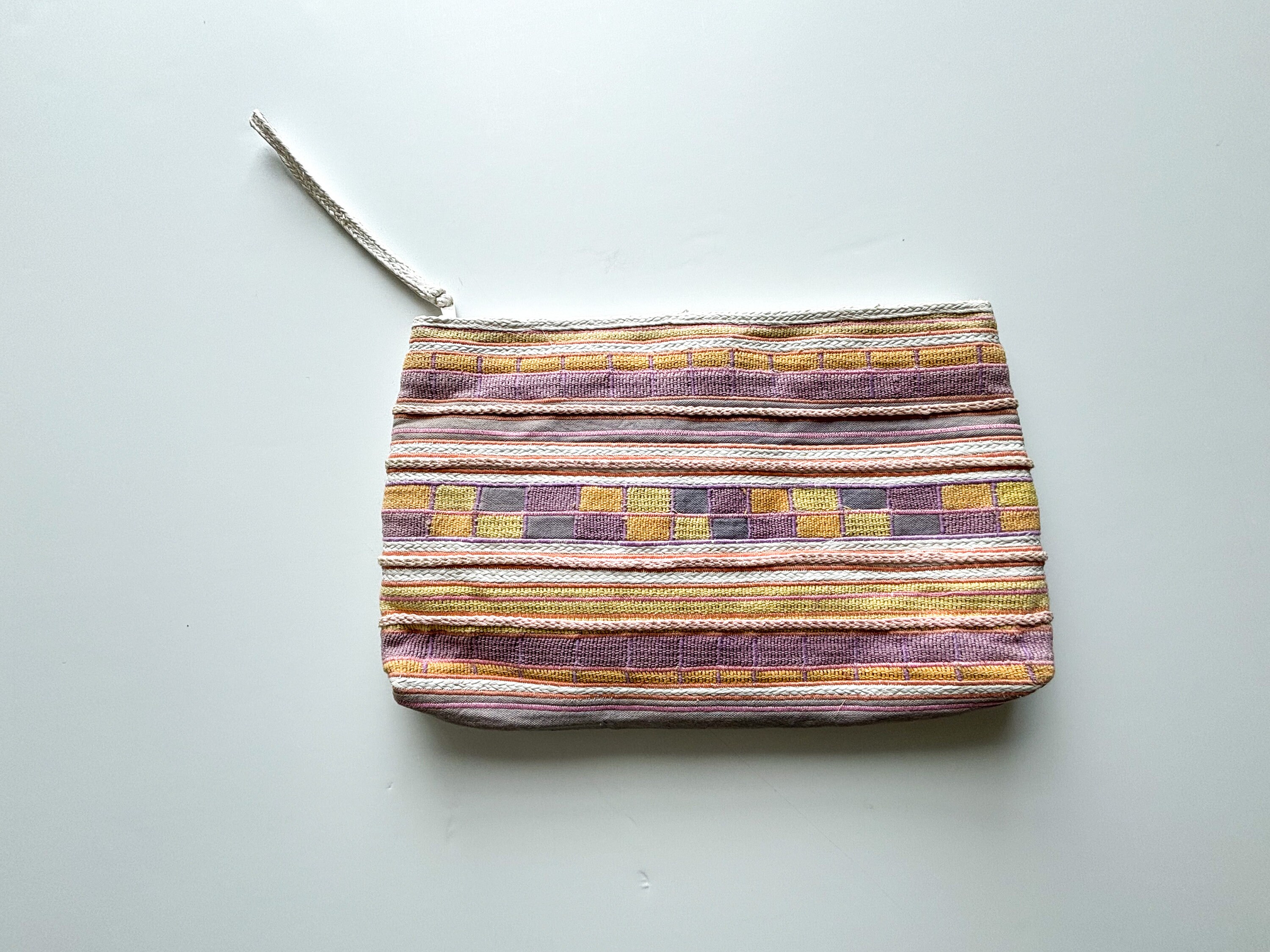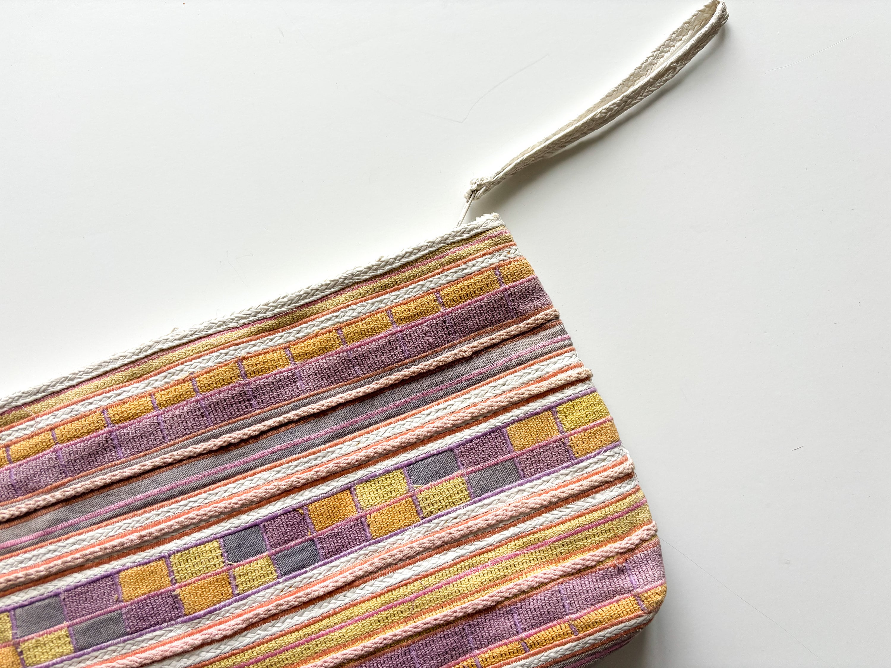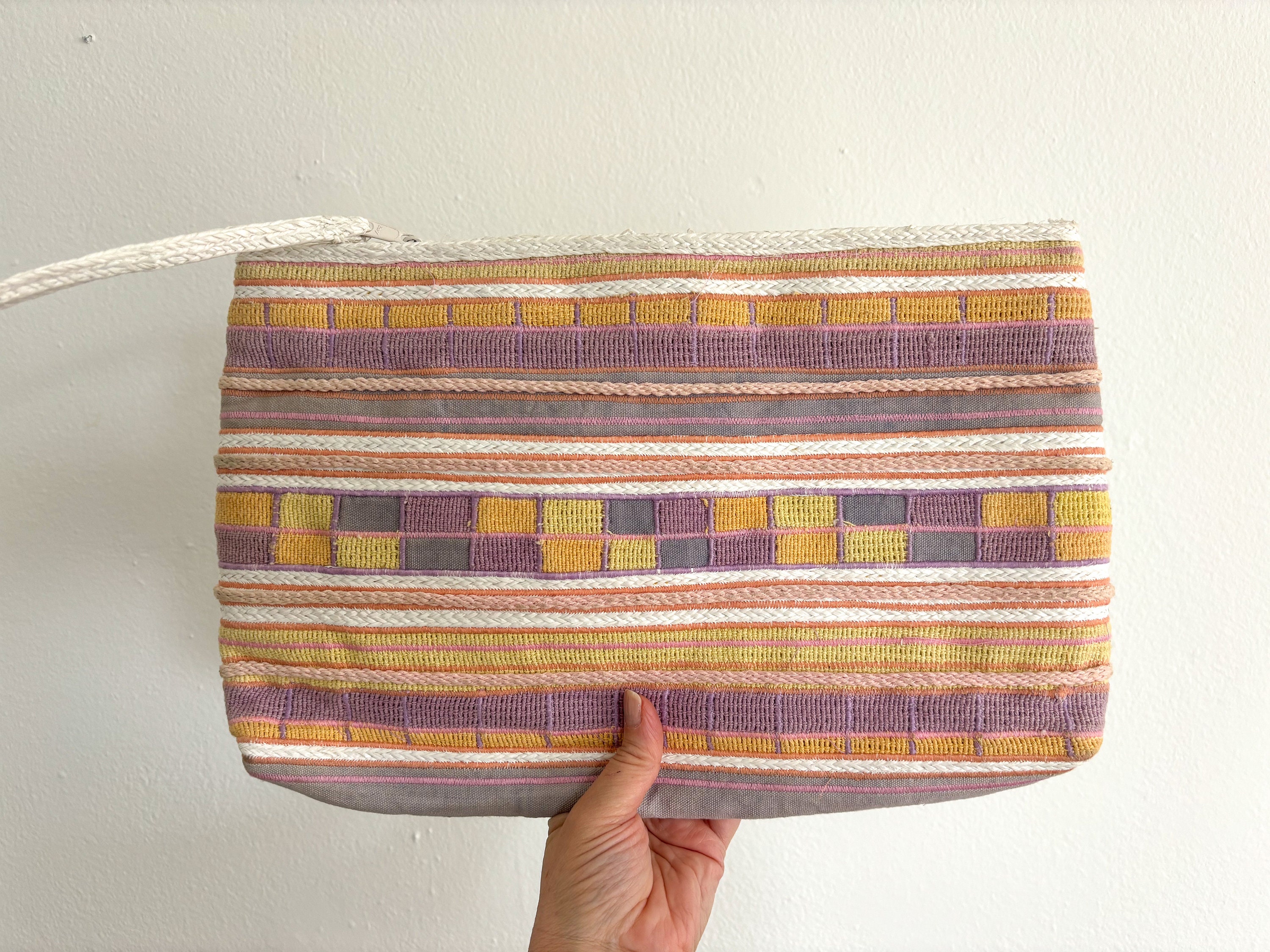 Preppy 80s clutch purse with vertical stripes in beachy muted colors of pinks and purples. Wrist strap. Zipper closure. Fully lined in a white fabric with one interior side pocket.