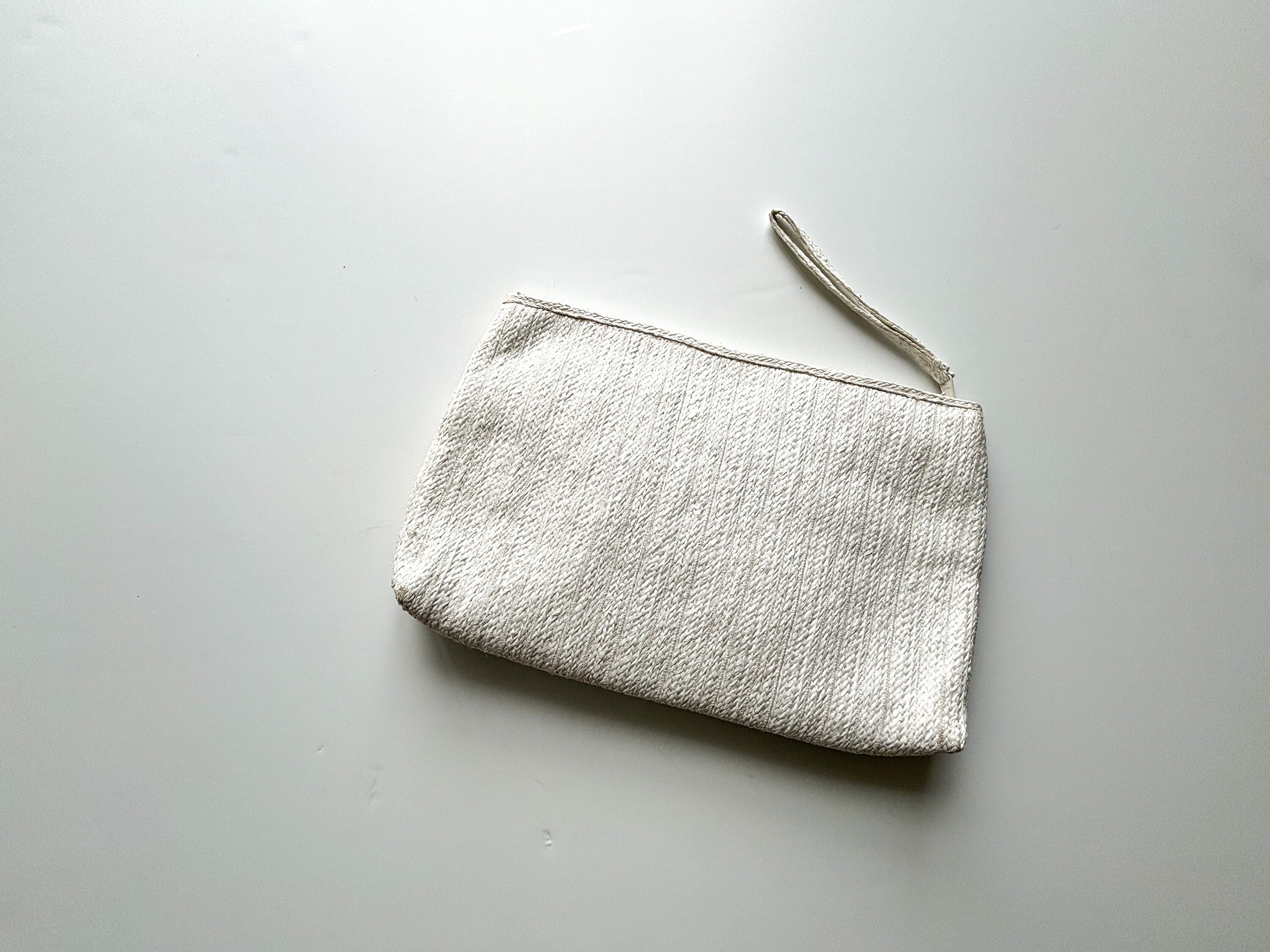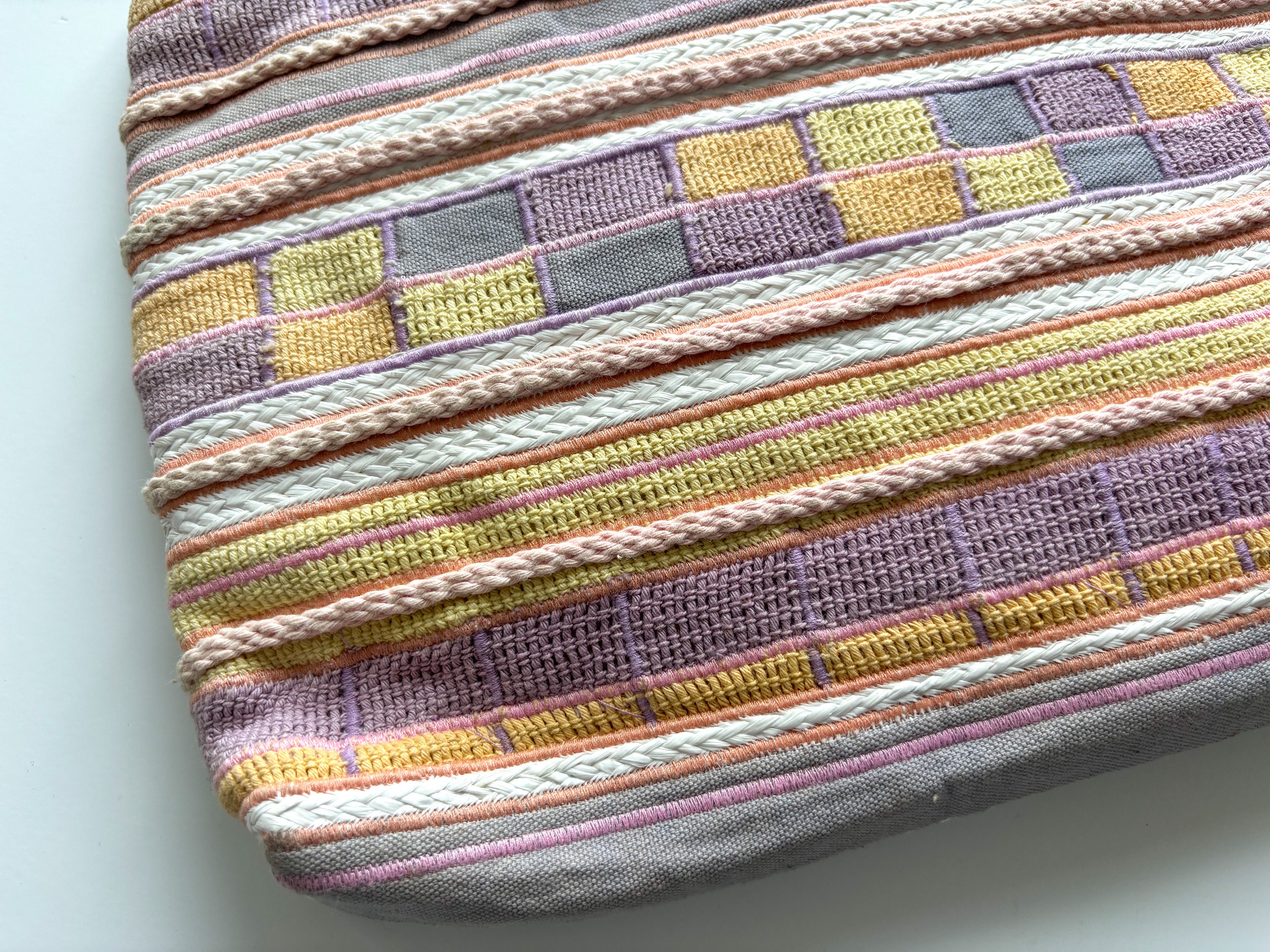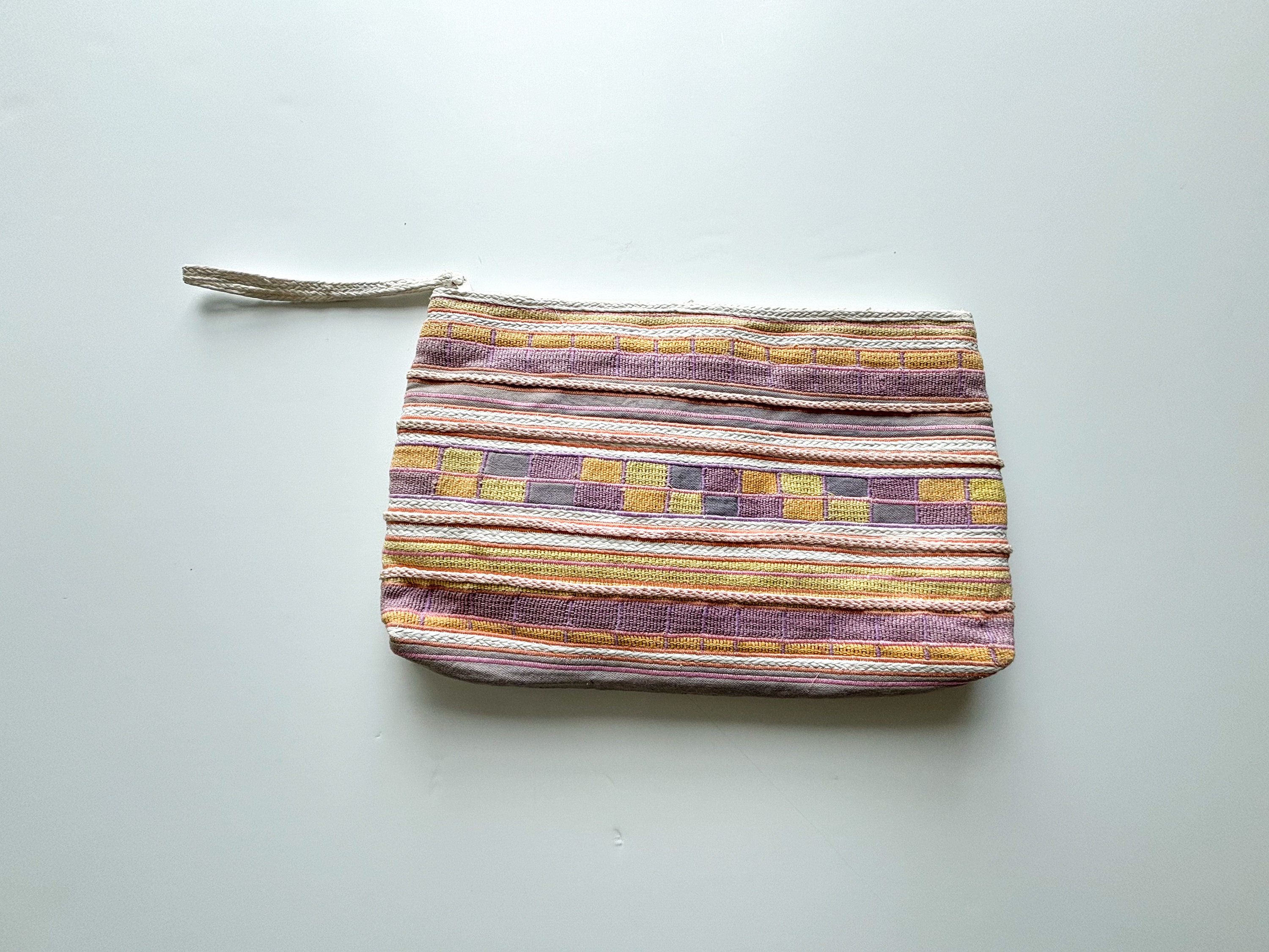 Preppy 80s clutch purse with vertical stripes in beachy muted colors of pinks and purples. Wrist strap. Zipper closure. Fully lined in a white fabric with one interior side pocket.