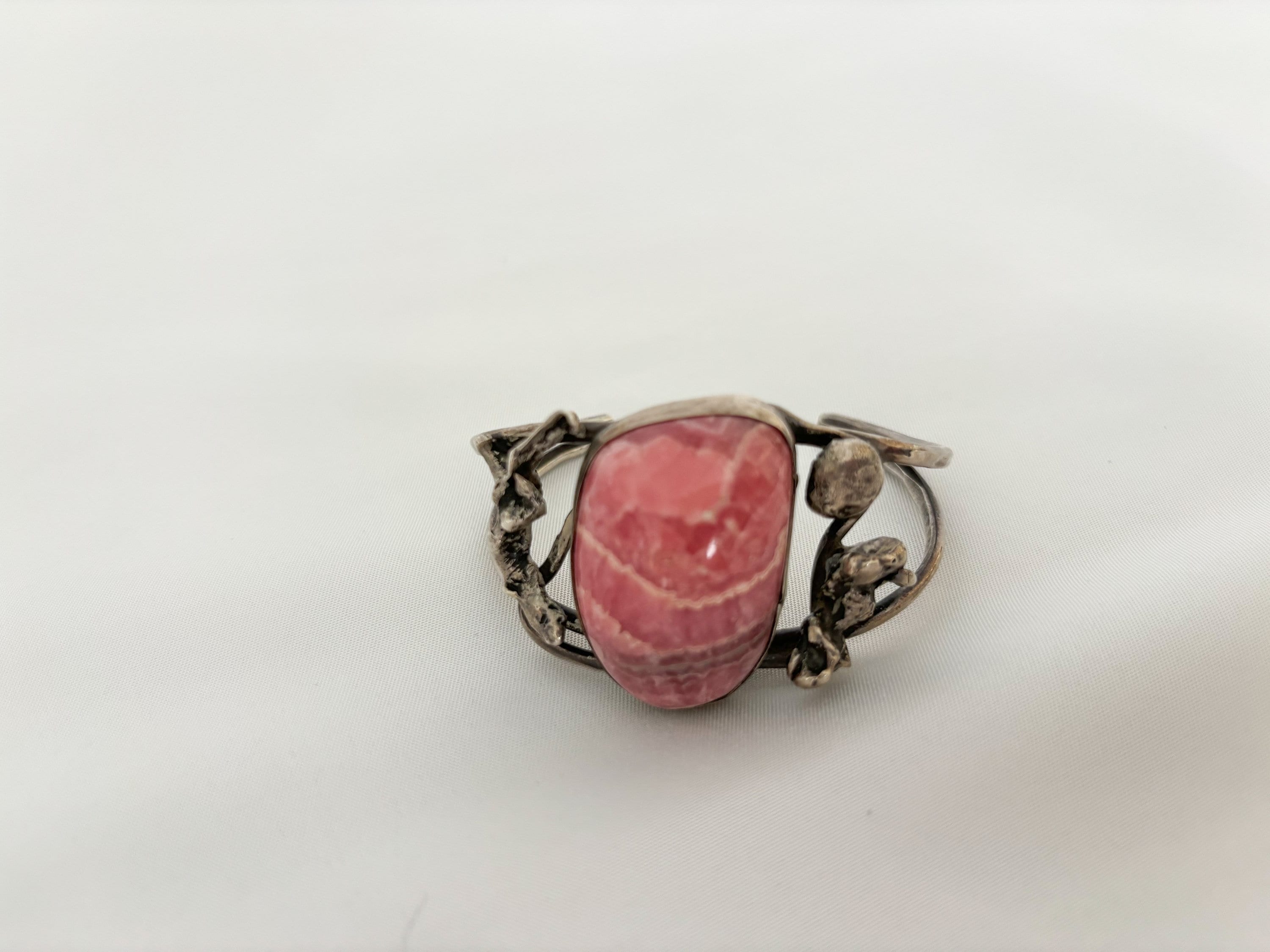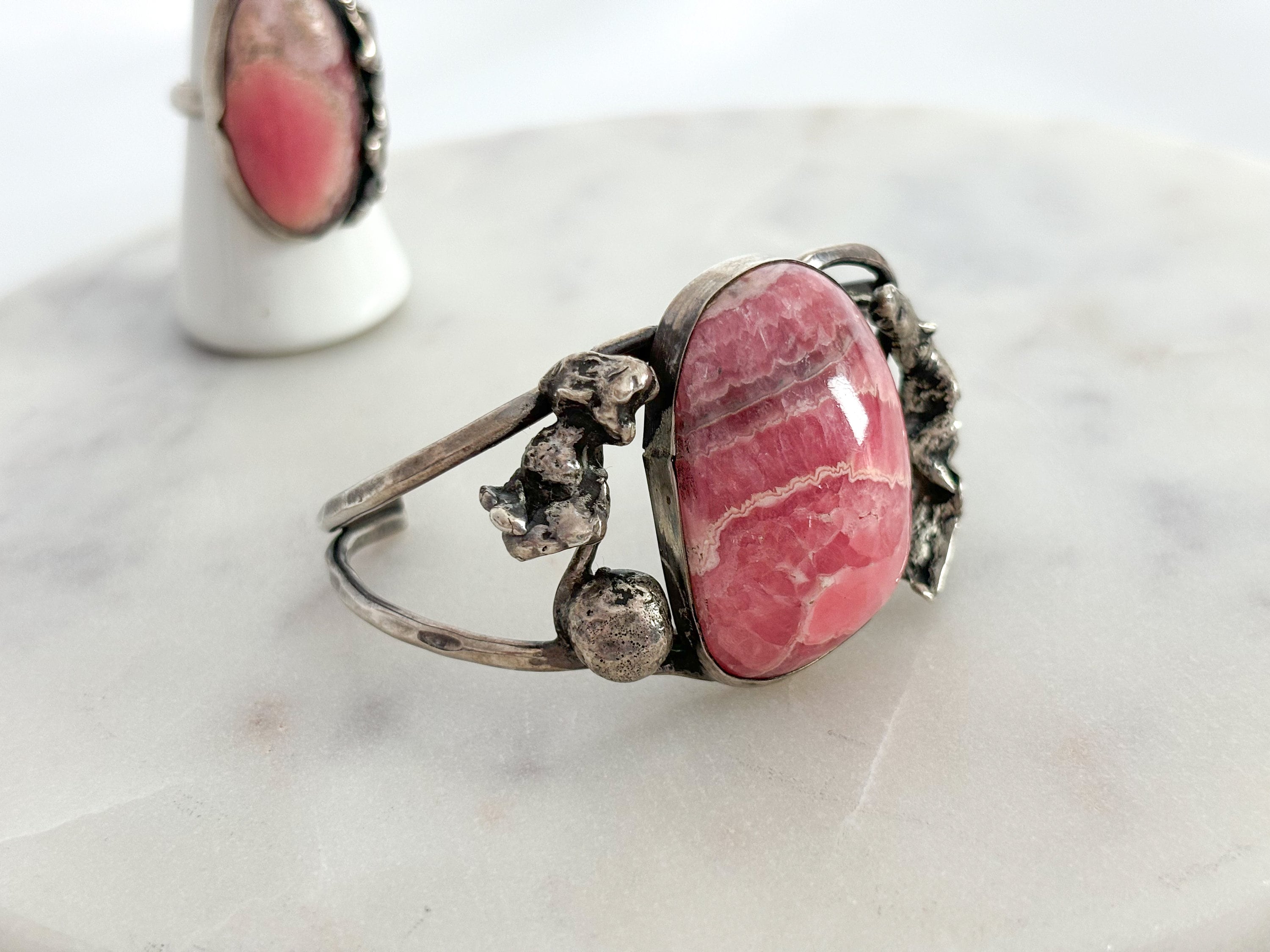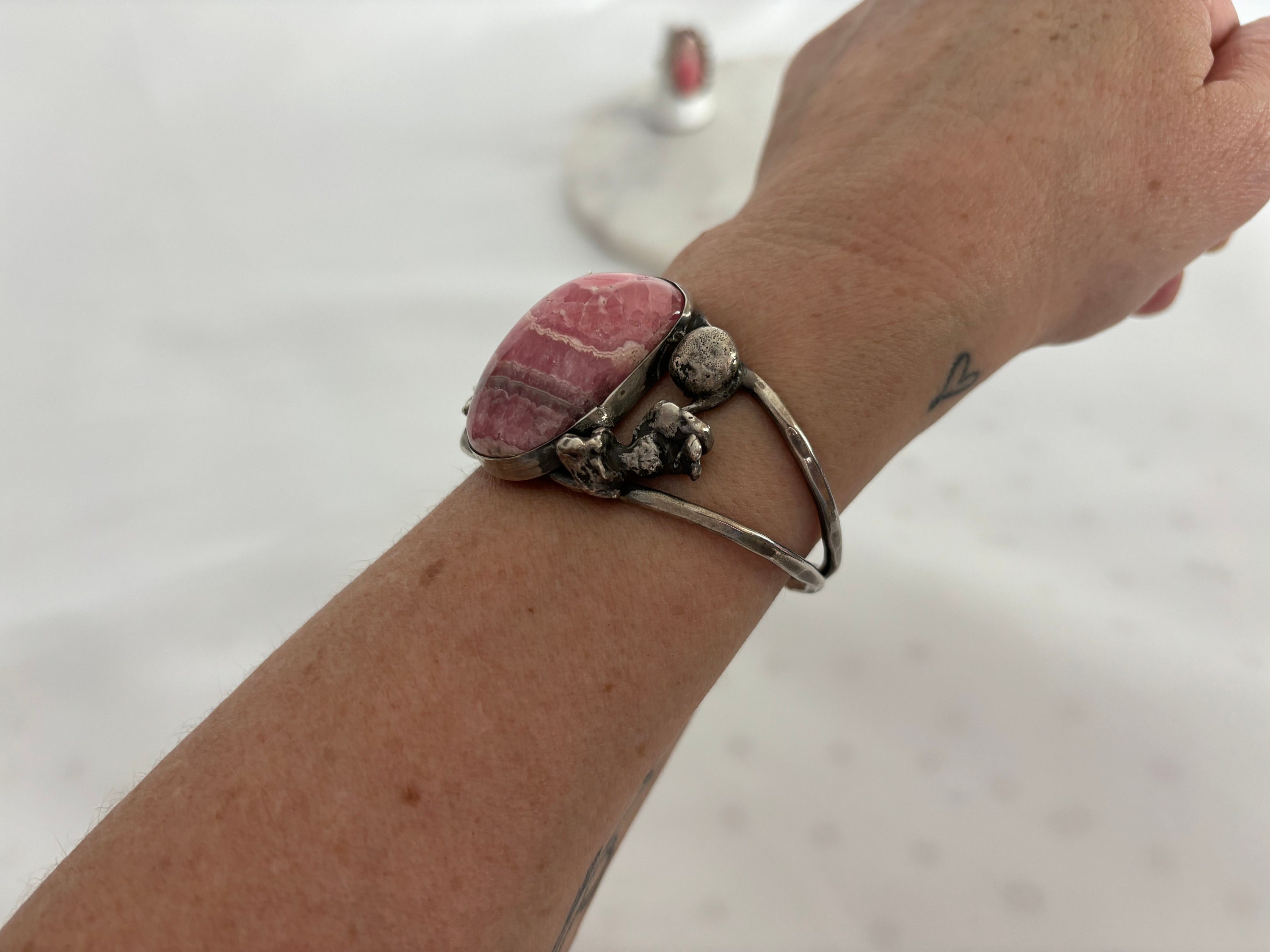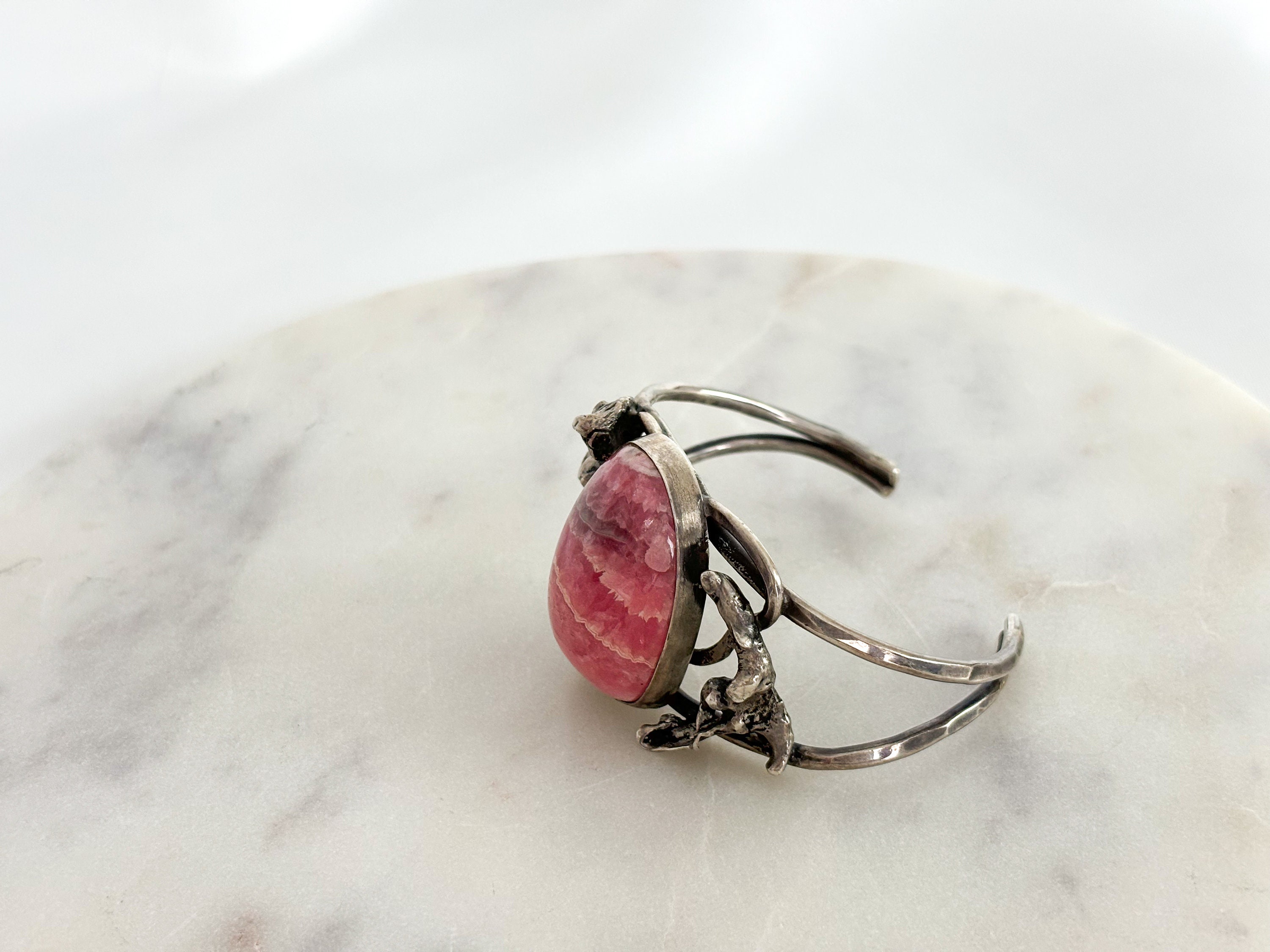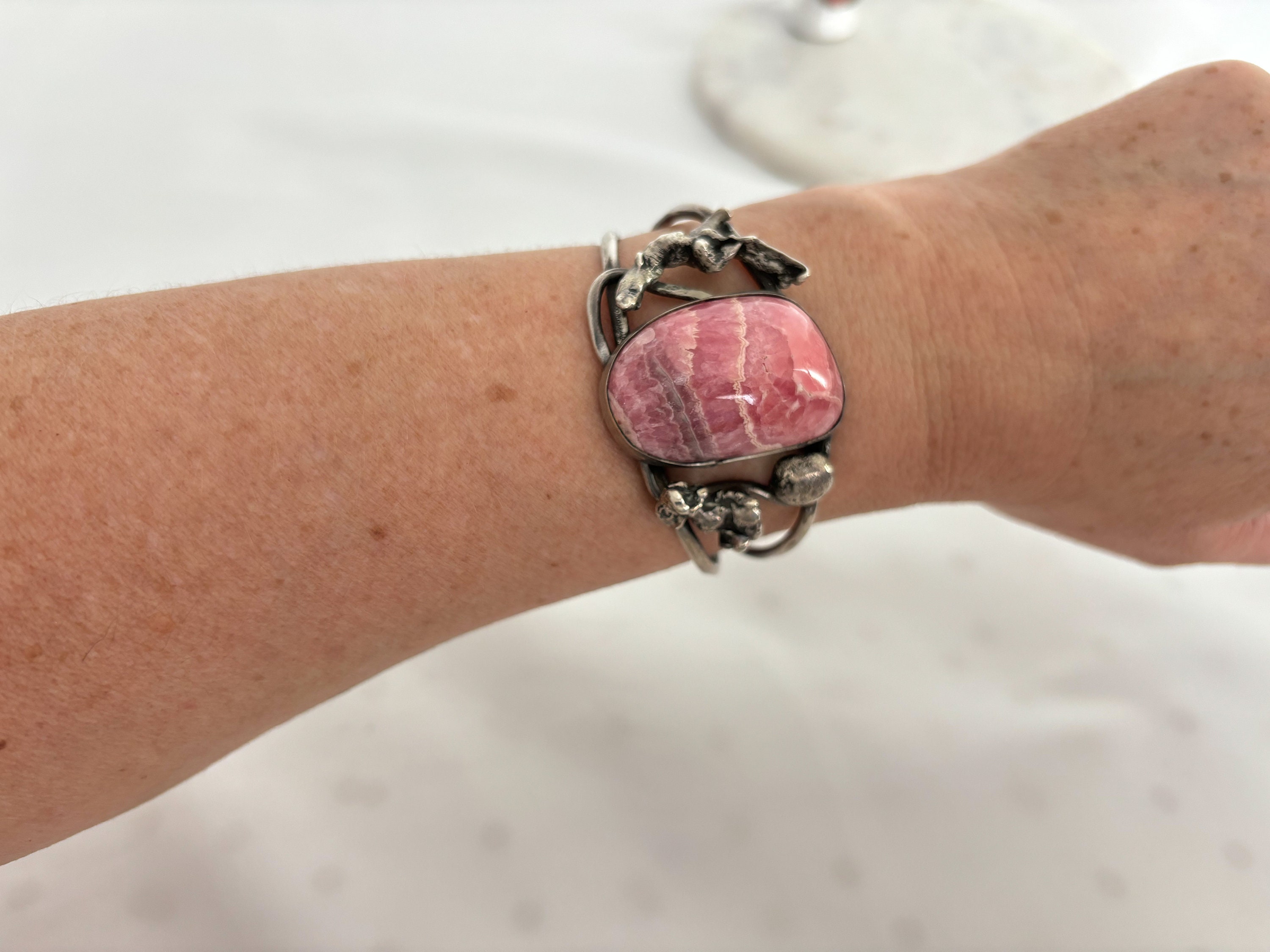 Gorgeous hand-wrought sterling silver cuff bracelet around a large natural rhodonite stone. The oval stone is so mesmerizing with layers of light and dark shades of pink reminiscent of a sunset. Stone is smooth on the front and rough/natural on the back.