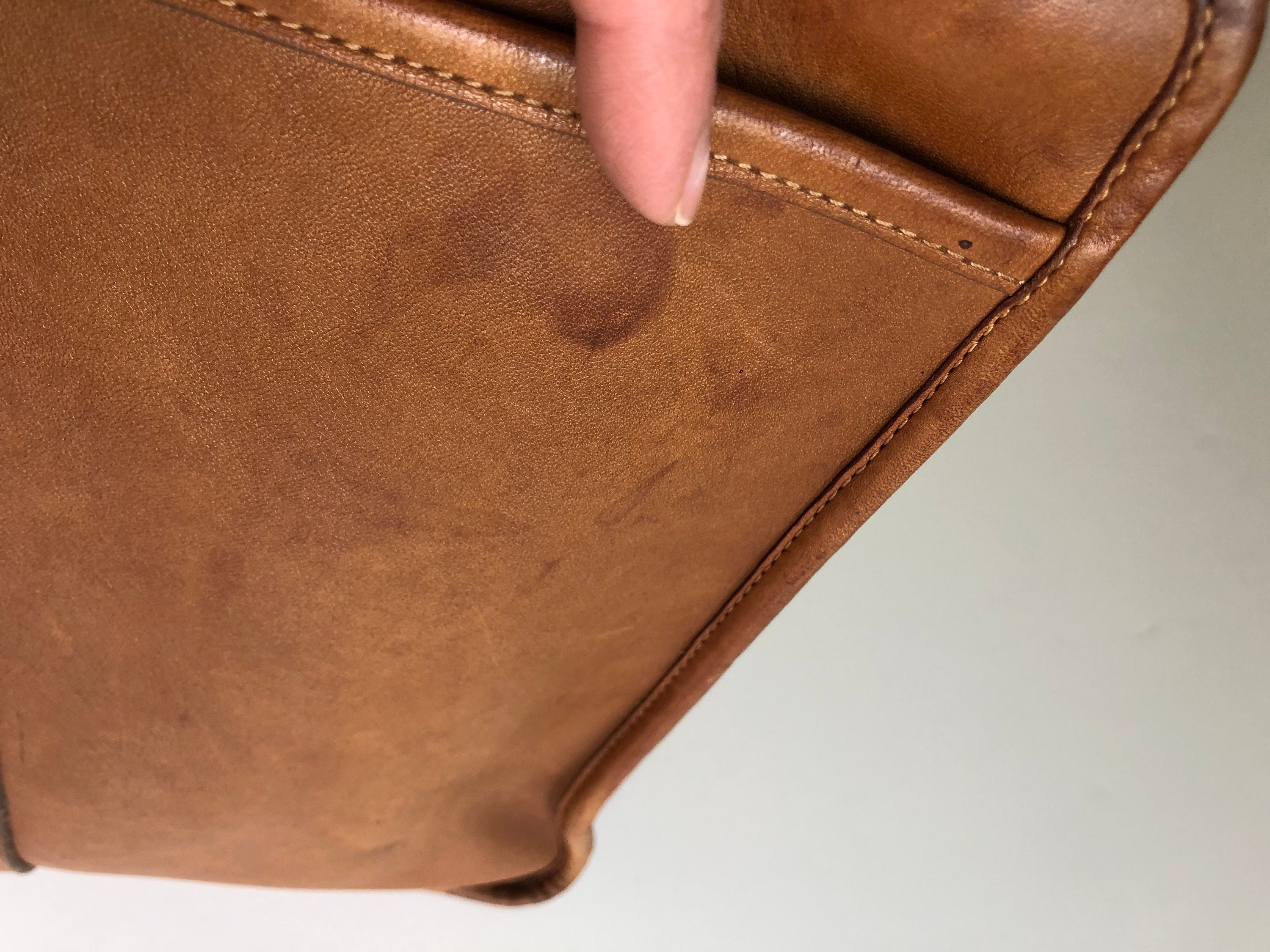 Leather is soft and supple. Bag is in amazing condition with a few very small exterior stains consistent with its age; could possible come out with a good cleaning. Interior is the rough hide leather and honestly looks like it has never been used.