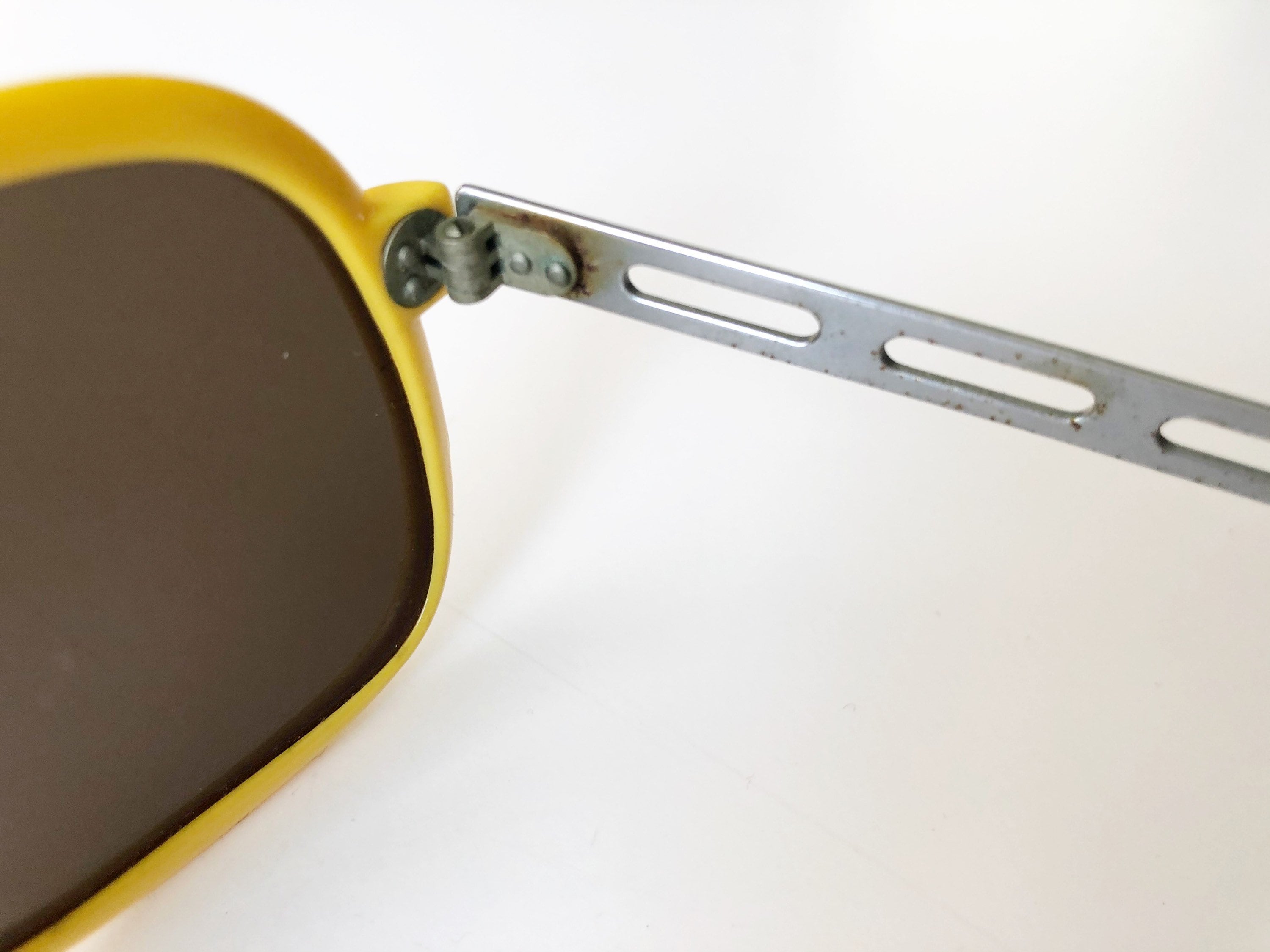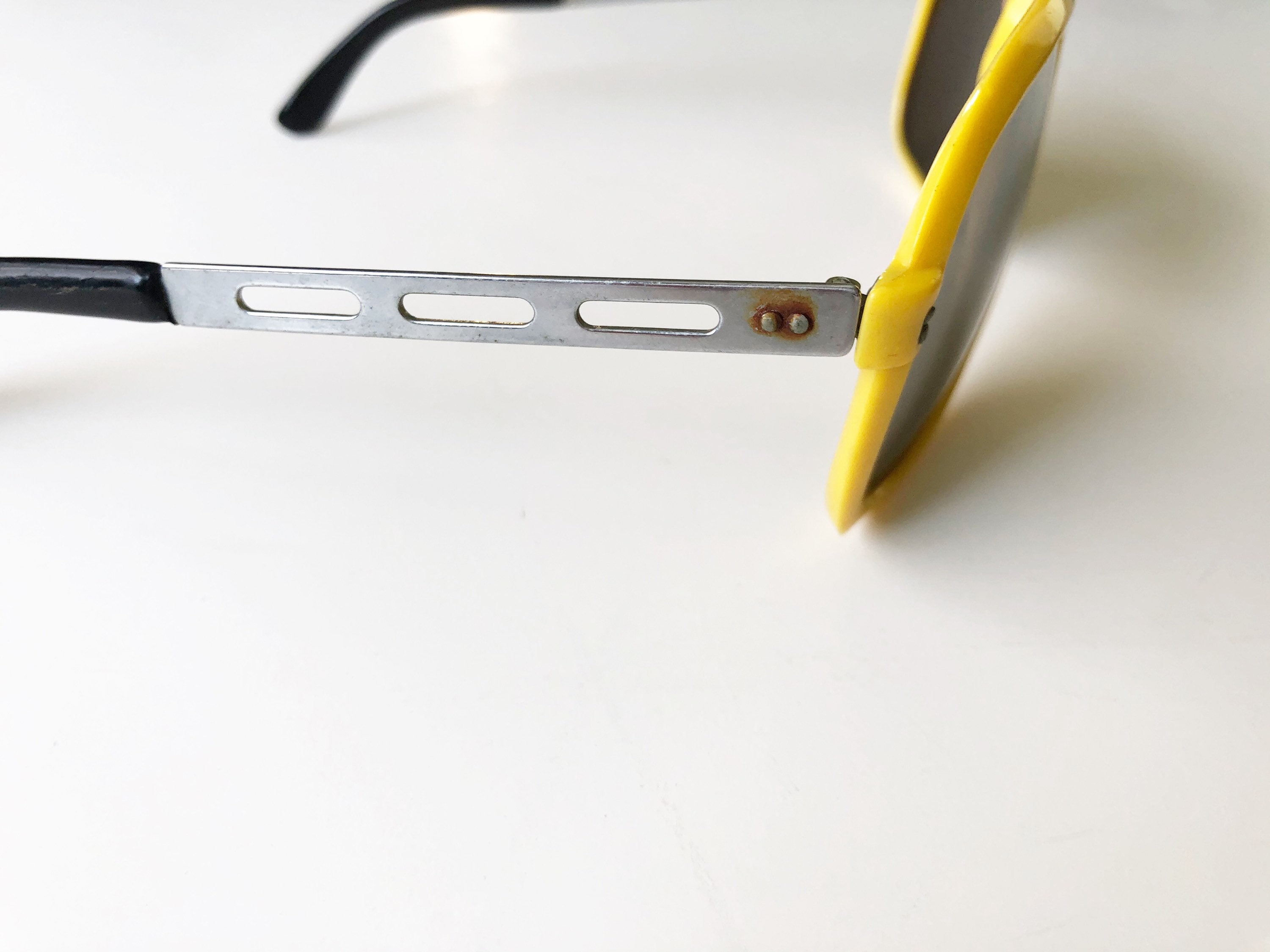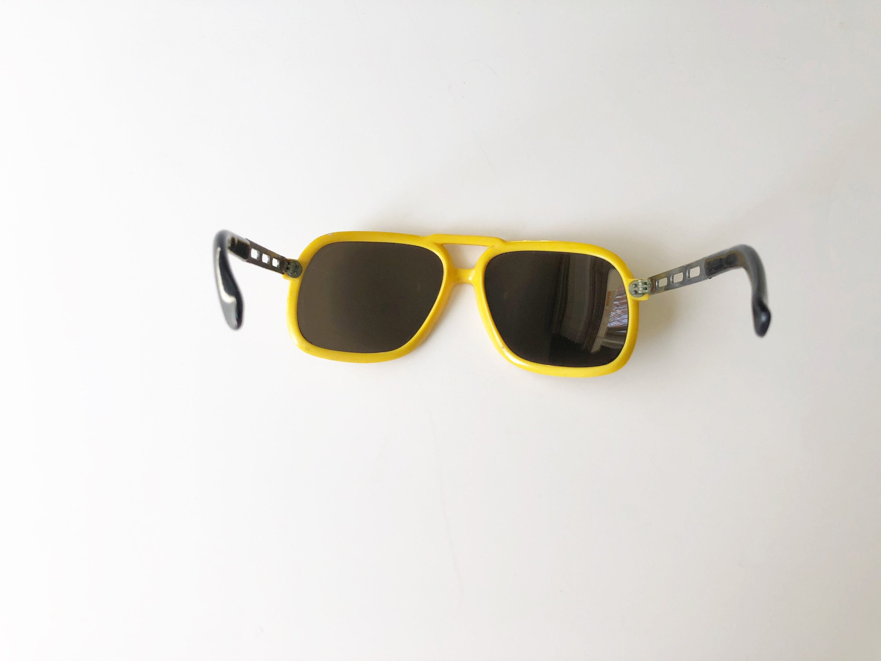 Uber cool plastic yellow frame mirrored glasses. Marked France. Believed to be safety glasses or ski patrol glasses. Mirrored frames are in perfect shape with no scratches. Joining screws have light rust but could be sanded off it desired (not really noticeable though). Perfect for smaller head/face width.