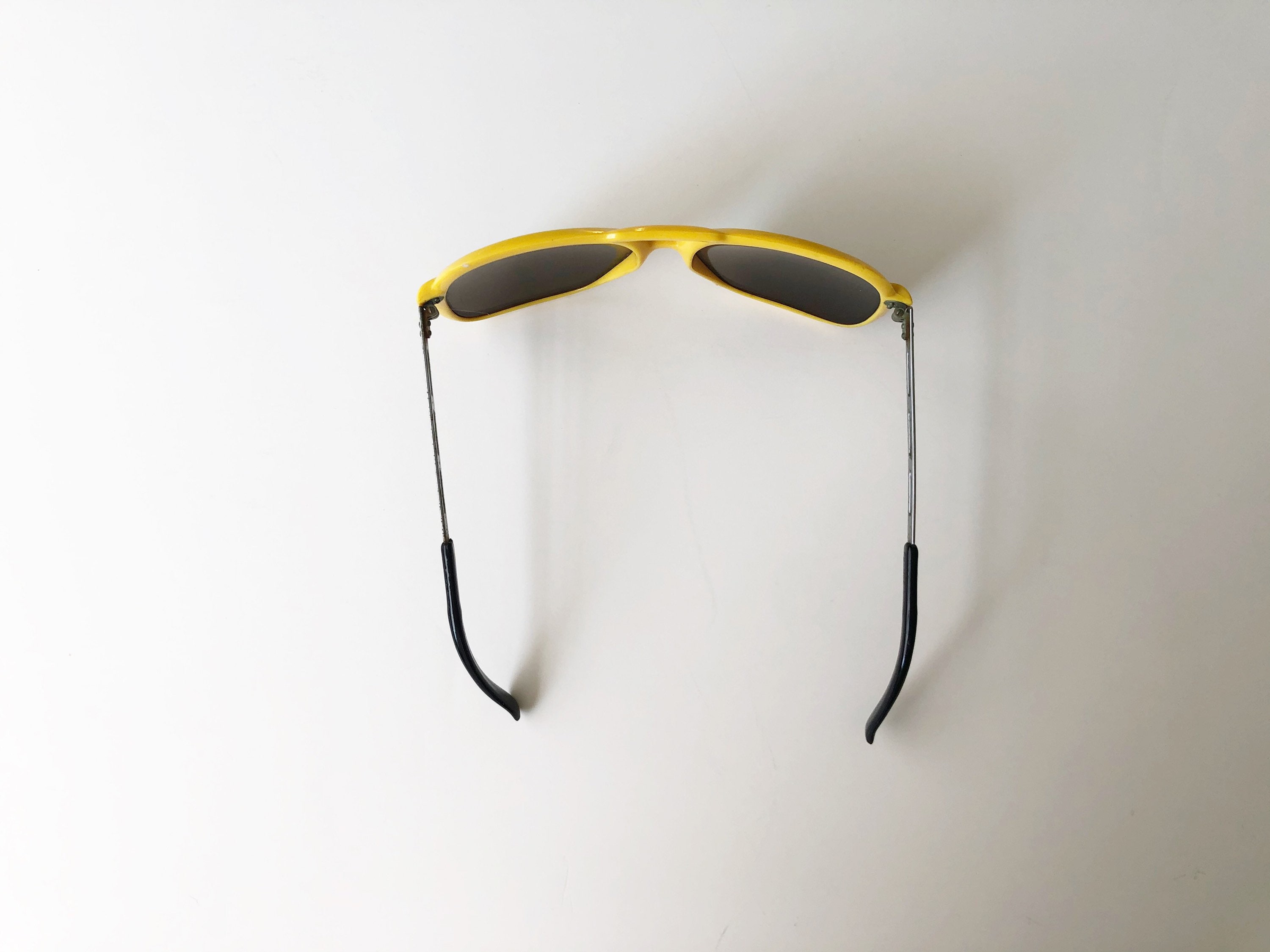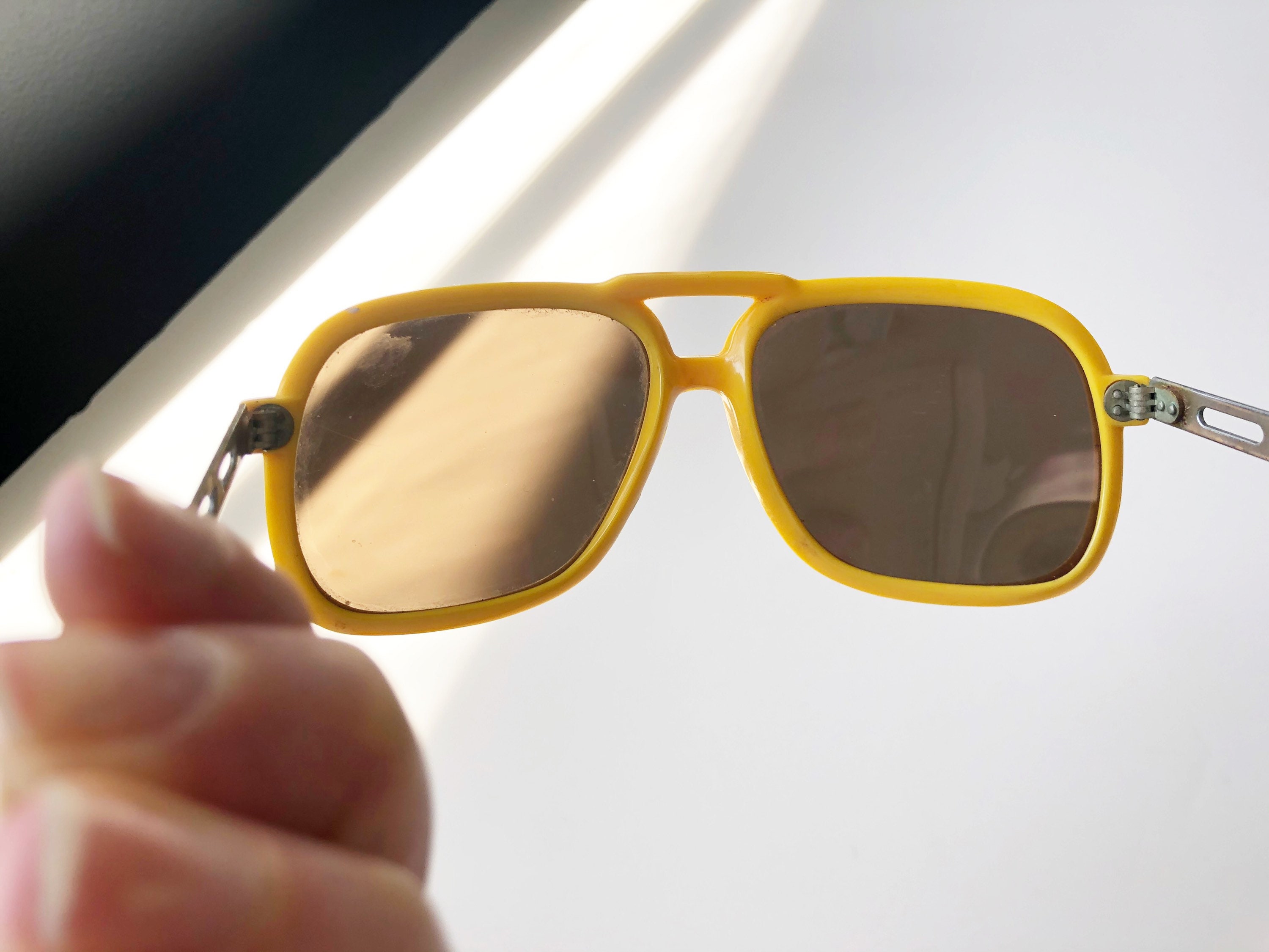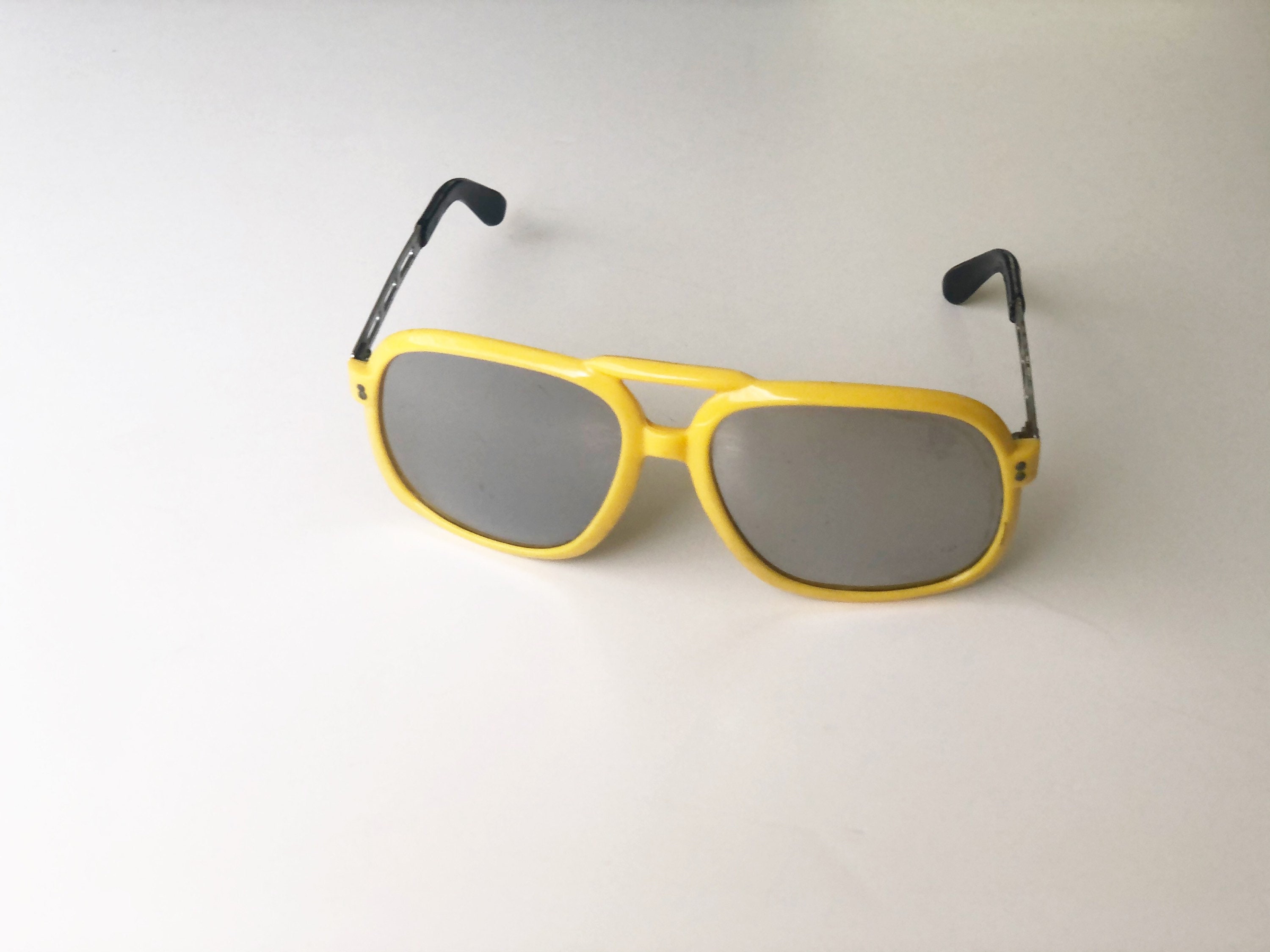 Uber cool plastic yellow frame mirrored glasses. Marked France. Believed to be safety glasses or ski patrol glasses. Mirrored frames are in perfect shape with no scratches. Joining screws have light rust but could be sanded off it desired (not really noticeable though). Perfect for smaller head/face width.