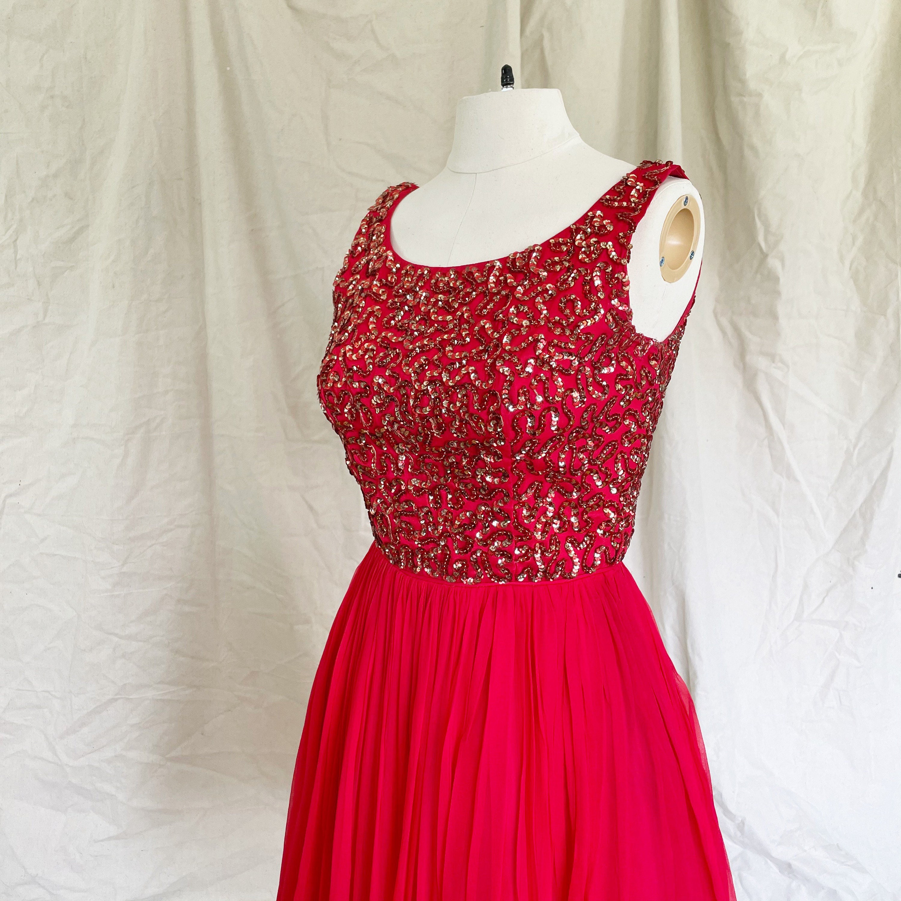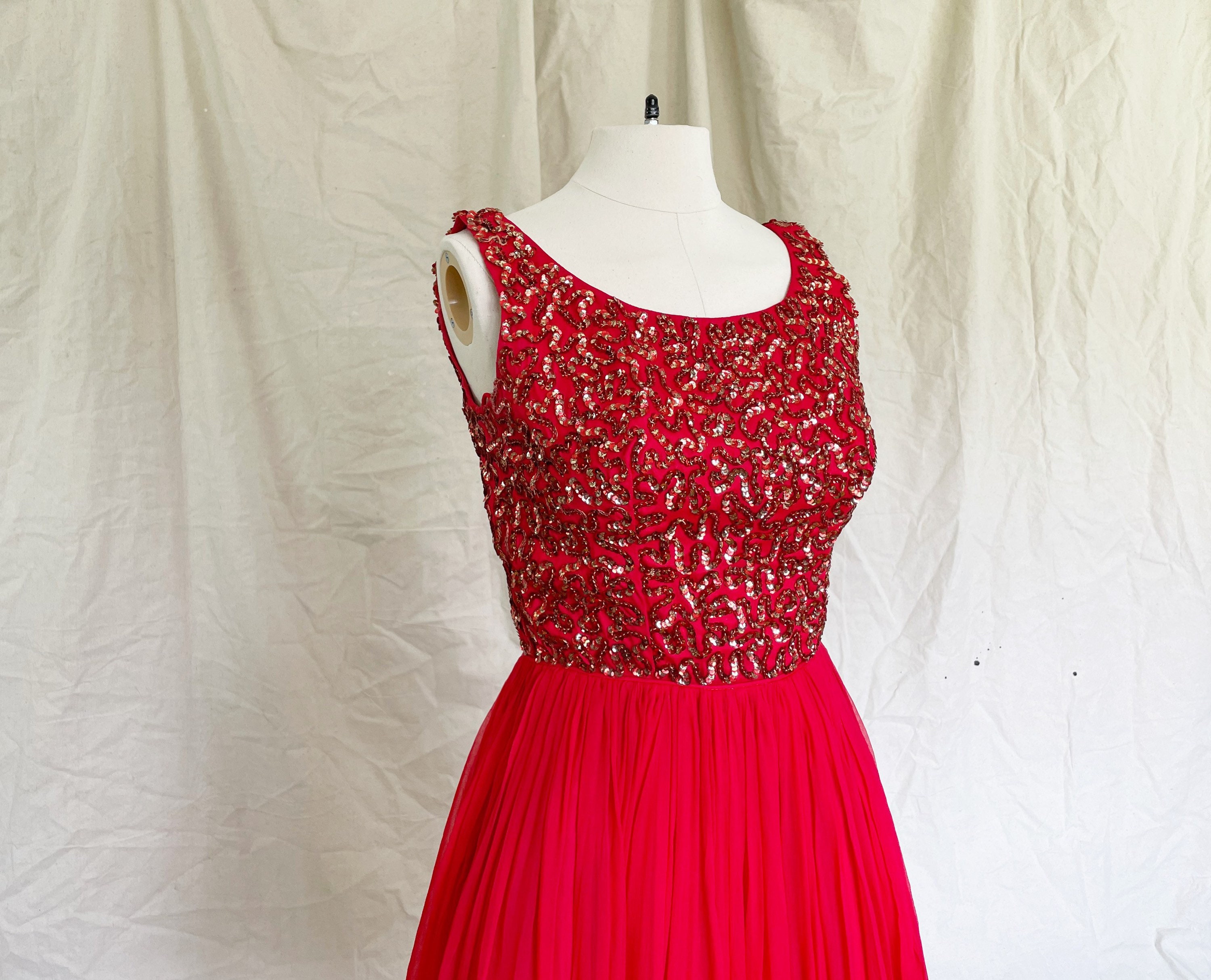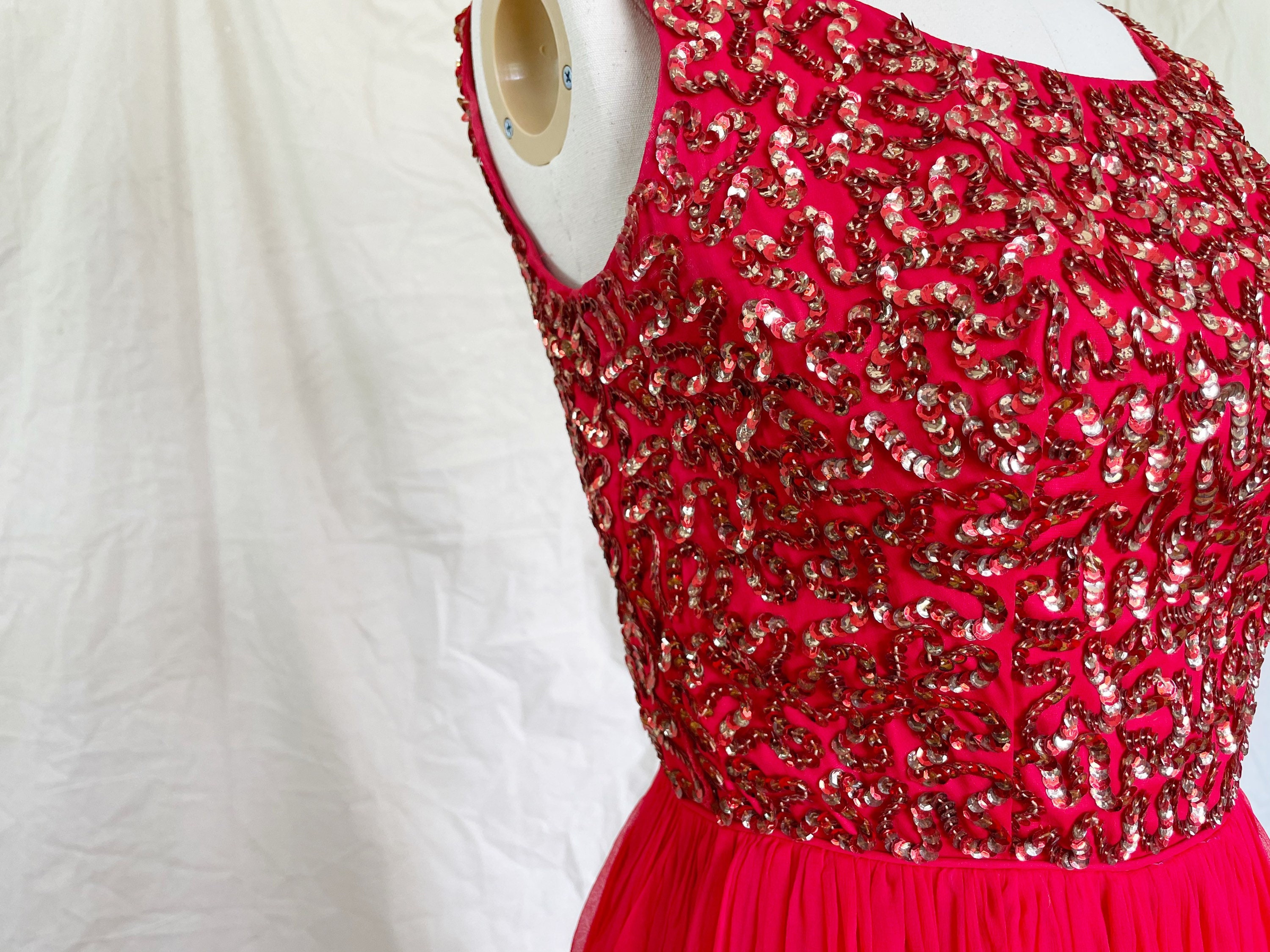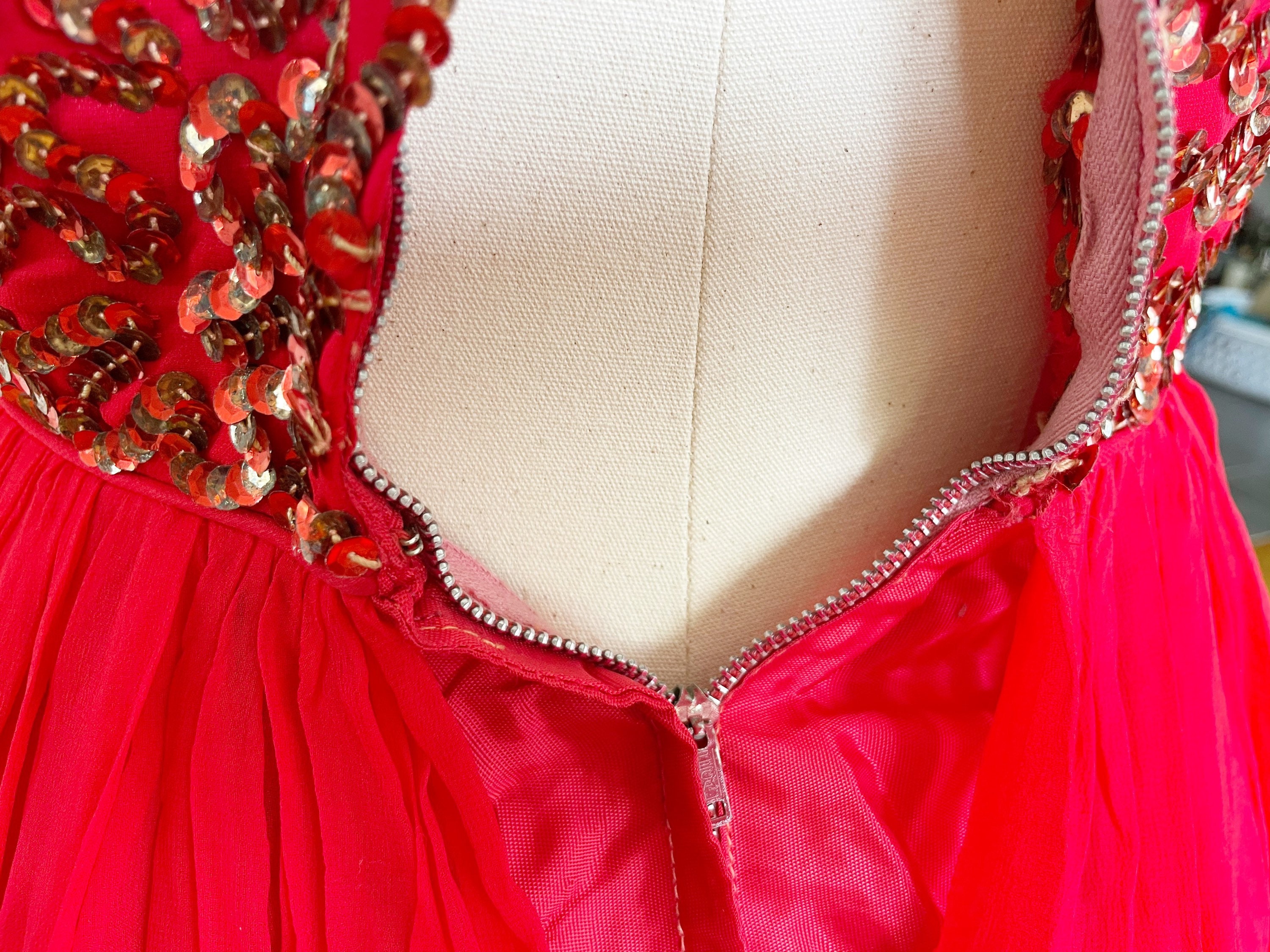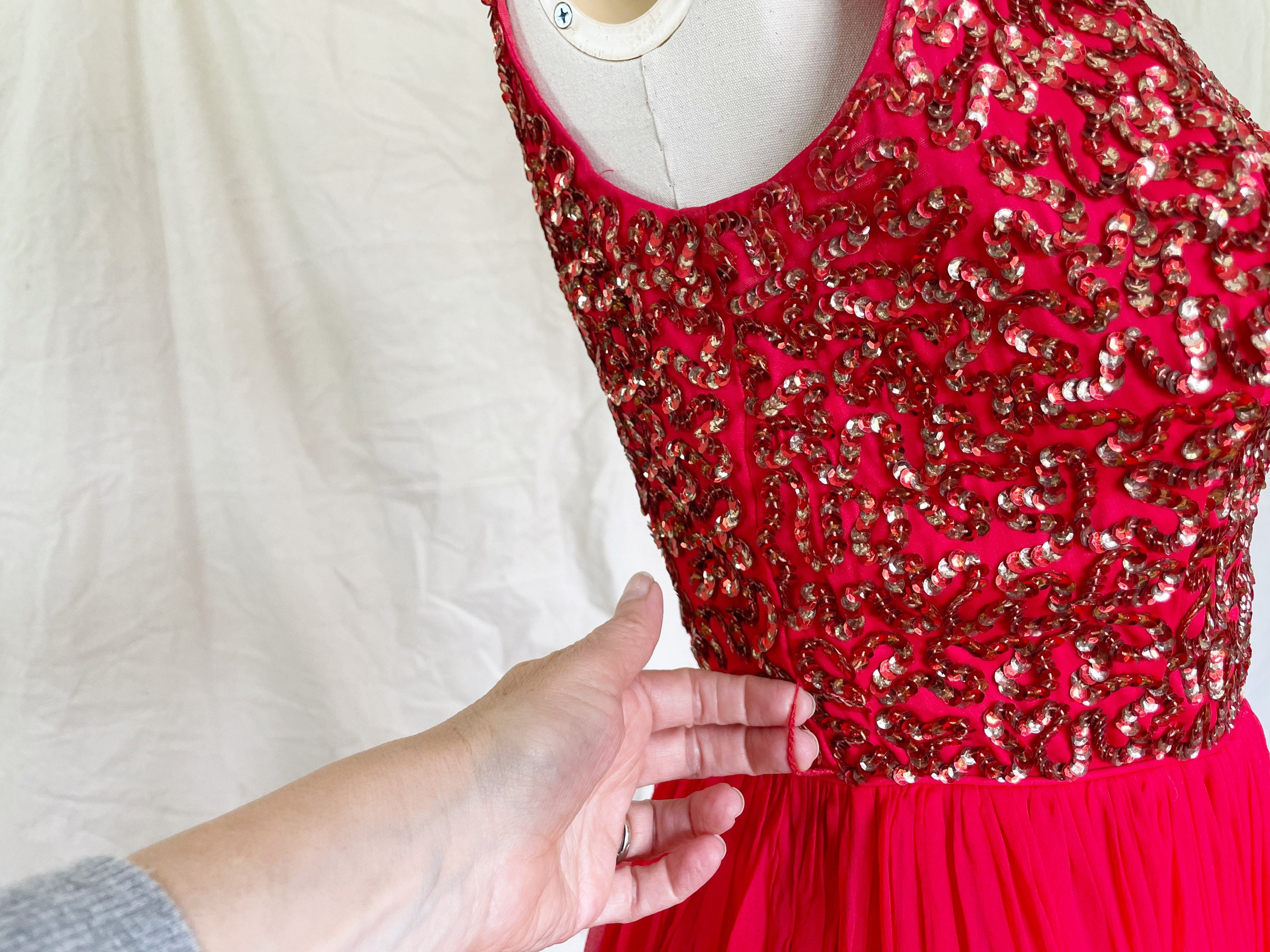 Lovely sequins in squiggly pattern on the bust with flowly cinched chiffon on the lower half. Acetate fabric slip underneath the layer of chiffon.